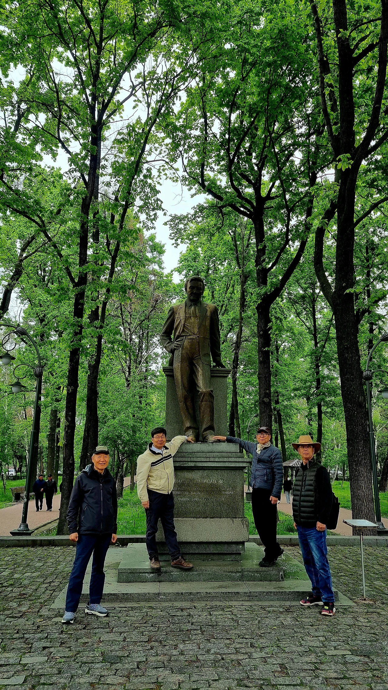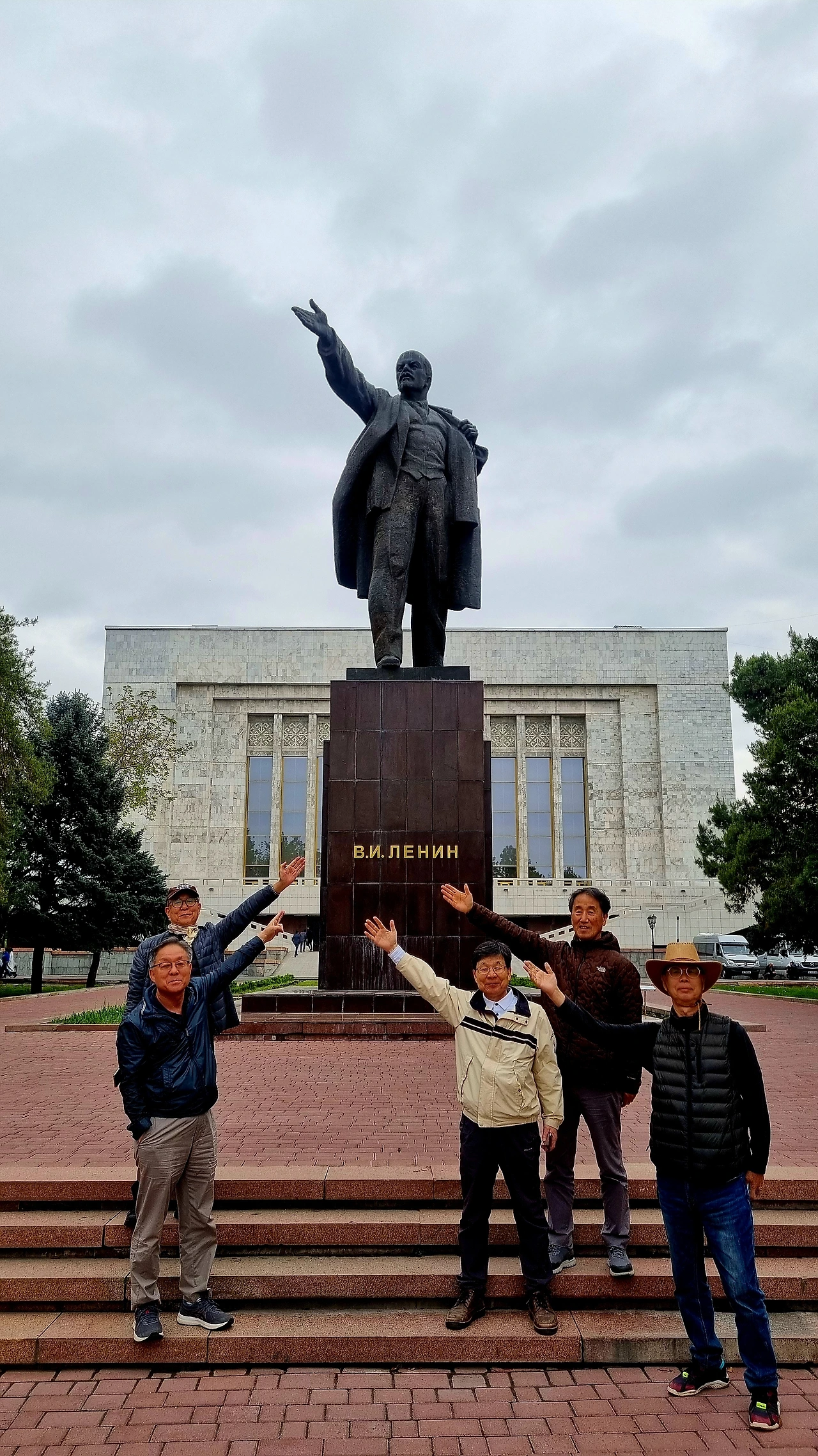 얼른 시내 구경을 하고 공항으로 향해야만 한다. 차를 타고 알라투 광장 앞에서 내리고 다음 탑승장소를 지정해 주었다. 광장을 가로질러 마나스장군의 동상 앞에서 사진을 찍고, 역사박물관 옆 옥외에 전시되어 있는 석상을 구경하였다. 유라시아 초원에 흩어져 있던 석상과 거석문화를 바라보면서 잠시나마 제주도의 돌하루방과 이스터섬의 모아이 석상을 연상했으리라. 원래는 역사박물관 앞에서 위용을 자랑했으나, 독립 후 새로 만든 마나스장군상에게 양보하고 박물관 뒤편으로 이전한 레닌동상을 구경하였다. 이 또한 20m 높이는 됨직한 거대한 동상이다. 우리 모두 젊은 시절 한 때 숭상했던 혁명가이기에 바라보는 눈길이 아련해졌다. 동상 앞에서 그의 손짓을 흉내 내면서 단체사진을 찍었다. 나중에 내가 그 사진에 “변절자들”이란 제목을 붙여 봤다. 민중혁명의 이상으로 제정 러시아를 무너뜨리고, 세계의 반을 그의 사상으로 뒤덮었던 사나이. 그러나 오늘날은 빛바랜 이념으로 치부 받으며 역사 속으로 사라진 혁명가. 그의 동상 앞에서 한 인생의 사상적 궤적과 허무함을 느낌은 나만의 생각은 아니리라. 레닌동상 맞은 편에 있는 대통령 집무실을 바라보며 사진을 한 장 찍고 한 블럭 지나 길 모퉁이에서 대기하고 있는 스타렉스에 서둘러 탑승하였다. 그 때까지 함께 걸어온 김철용 대표에게도 작별인사를 하였다.