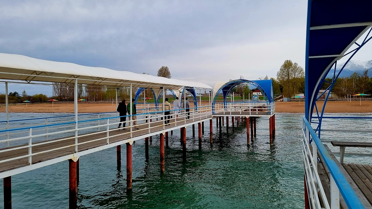 어떻게 잤는지 모를 정도로 잘 잤다. 침대 속에서 살그머니 목소리를 내보았다. 다행히 목소리가 나온다. 그래 마지막 날에는 두런두런 얘기라도 나눌 수 있어야지... 일출이 6시 38분이라고 했다. 7시쯤 룸메이트 신도철과 호숫가에 가보자고 밖으로 나갔다. 벌써 김상열과 정학섭이 로비에 나와 있다. 4이서 천천히 호숫가에 이르니 일출 시간에 맞춰 이미 호숫가를 거닐고 돌아가는 김석진과 옥한석을 마주쳤다. 다시 돌이켜 세워서 6명이서 호수에 지어 놓은 나무데크 끝까지 걸어가면서 사진도 찍고 풍광도 감상했다. 오늘 아침도 호수 건너 남쪽의 설산은 구름에 가리워져 있지만, 북쪽 설산은 꽤 잘보인다. 동쪽 하늘 멀리 구름이 짙게 드리워져 일출은 보지 못했으리라. 아쉬운 마음에 이시쿨 호수물에 손을 담가 보라고 권유했다.