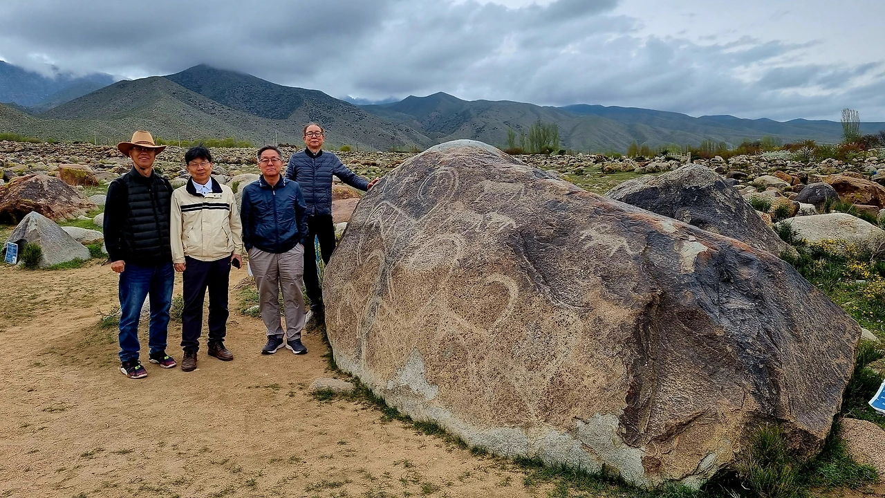 어제 시간이 늦어져서 못 본 암각화공원을 가기로 하고 다시 촐폰아타로 되돌아갔다. 암각화공원(The Petroglyps of Chopon Ata)은 도시 윗 편 산중턱에 있다. 산록에 어마무지하게 많은 돌덩어리들이 널려있고, 뒷산의 큰 봉우리들도 순전히 돌무더기산, 그야말로 뇌산(磊山)이다. 저 남쪽 아래로 이시쿨호수가 내려다보이는 명당이다. 이 곳에 수천 점의 암각화가 그려진 바위가 있다고 한다. 언제 어느 시절에 누가 그린 것인지 정확하게 설명하고 있지 않지만 그 옛날 원시수렵시대의 생활상이 바위 위에 그려져 있다. 주로 동물들의 모습이고, 간혹 사냥하는 장면도 있다. 또 크지는 않지만 간결하게 만든 석상(Barbar)들도 있다. 아마도 돌아가신 어떤 분의 모습이 아닐까 싶다. 수천년 지난 후손들이 그들을 기억할 수 있으니 어찌 보면 영생불사하는 한 방편이라는 생각도 든다. 좀 더 뚜렷하게 남아있는 암각화를 찾아가서 감상하고 사진을 찍었다. 삭막한 돌 산 위에서 인류의 초기 생활상을 목도할 수 있는 신묘한 야외박물관이다. 지리학자인 유계공이 각별히 큰 관심을 보인다. 당연히 그럴 것이다. 지구온난화로 산성비가 내릴텐데 이런 소중한 유물이 방치되어 부식되어 가고 있으니 안타깝다. 일본 JICA에서 지원하였다는 팻말이 있으나 그저 초소 설치하고 울타리 친 정도에 불과할 뿐 제대로 보존을 하는 수준은 아닌 것 같다. 지난 번에 왔을 때는 동네 아이들이 공치기 놀이를 하는 것도 목도하였다. 선진국 프랑스와 스페인의 암각화가 잘 보존되고 세계적인 주목을 받는 반면, 후진국 키르기스스탄의 암각화는 그냥 들판의 돌덩이 취급을 받고 있는 것 같아서 안타깝다. 수천년이 지나도 후손들이 잘 살아야 조상들이 대접 받는단 말인가?