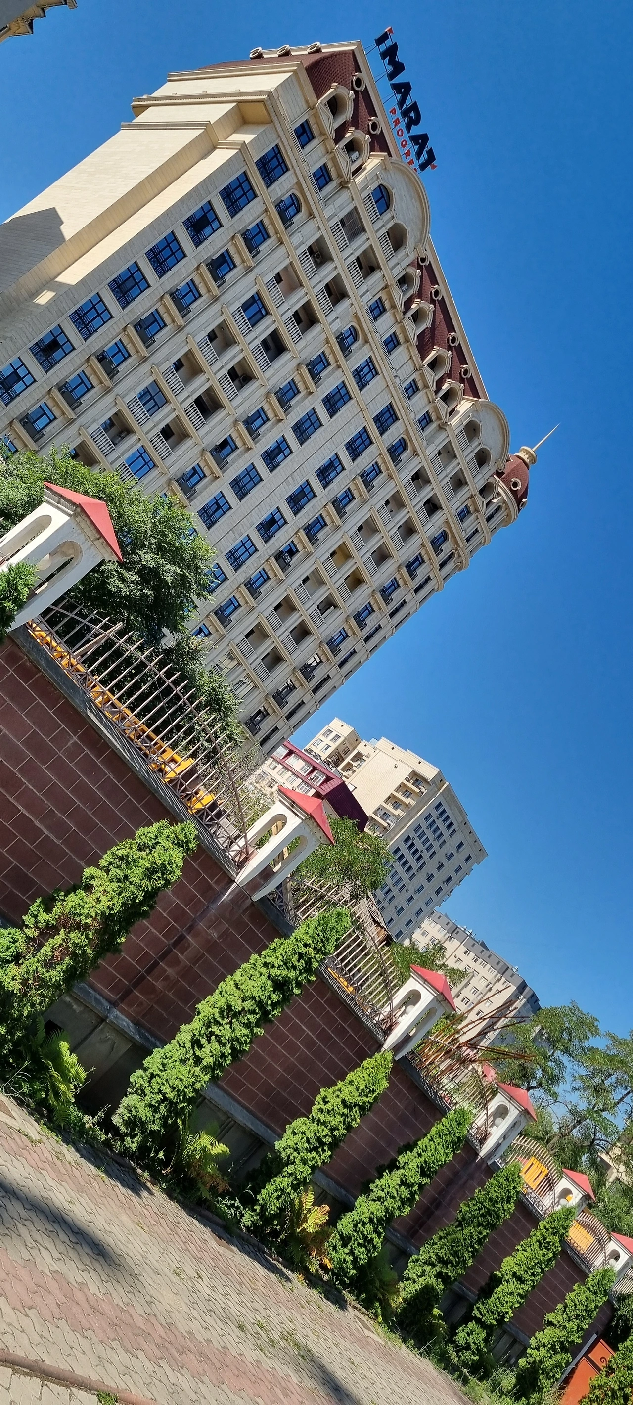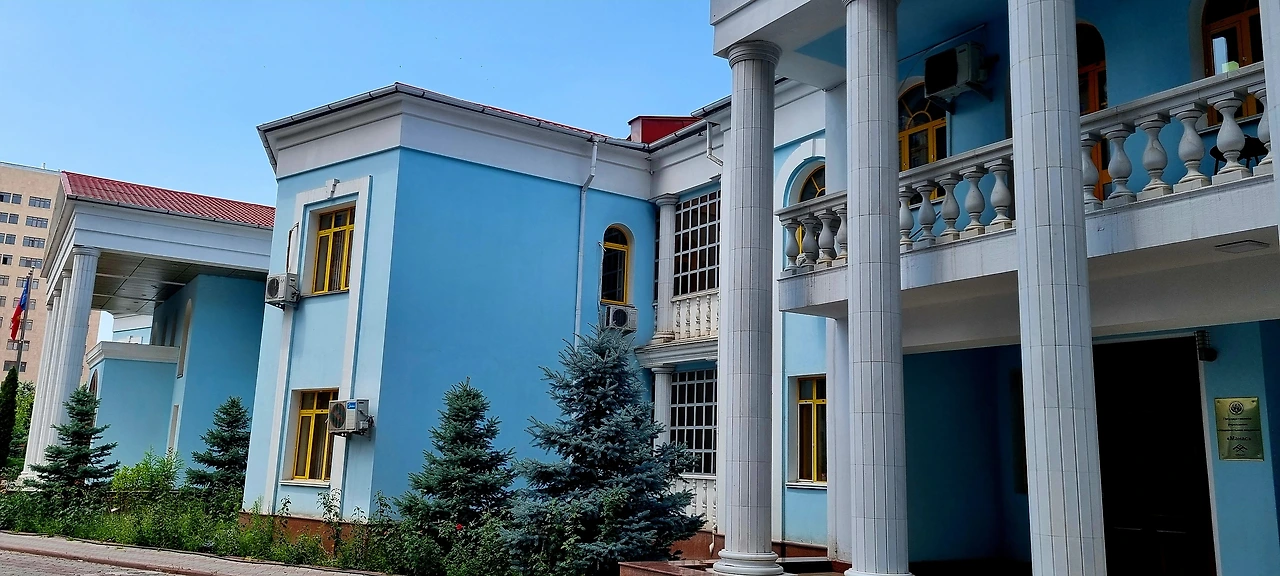 그런데 이사 와보니 의외로 멋진 건물이다. 크진 않지만 그리스 파르테논 신전 양식을 차용한 신고전주의 양식의 단아한 2층 건물이었다. 4개의 이오니아식 기둥이 페디먼트(pediment)를 받치고 서있는 삼각형 출입구가 3개가 있고, 교회양식처럼 둥근 창이 있는 하늘색으로 칠한 담자하고 기품있는 건물이다. 담장마저도 붉은 벽돌에 군데군데 망루같은 장식이 얹어져 있다. 키르기스의 민족 영웅인 마나스(Manas) 장군을 기념하기 위해 세운 「마나스 아카데미」 건물이었다.