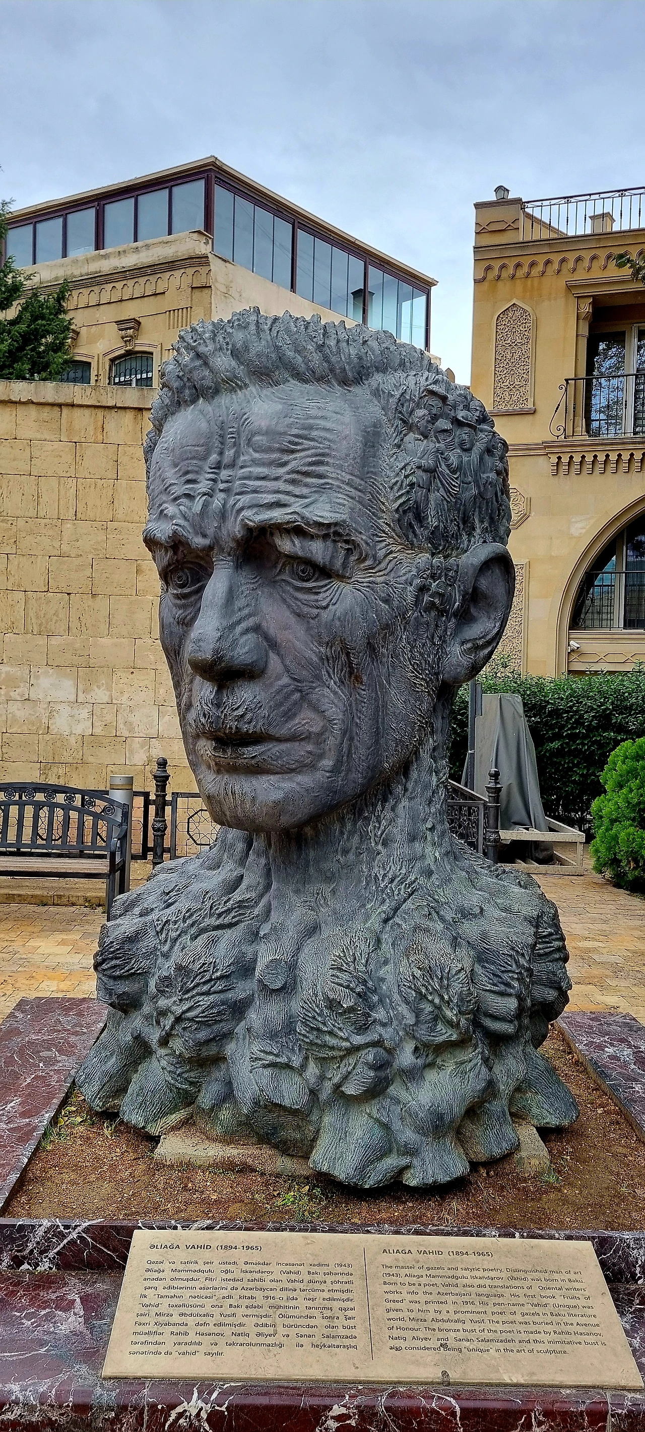 배가 든든해지니 힘이 솟구친다. 다시 구시가지 구경을 나섰다. 소소한 볼거리가 많다. 미니책자 박물관도 있고, 건물 벽에 넝쿨식물과 이끼를 활용하여 인물화를 만들어 놓았고, 심지어는 오래된 나무 등걸에도 사람 얼굴이 그려져 있다. 무엇보다 이 곳은 고양이 천국이었다. 귀엽게 생긴 회갈색 고양이들이 곳곳에 어슬렁거리고 사람들을 따라 다녔다. 아래쪽으로 내려오자 작은 공터에 높이가 2미터가 넘는 이지적인 얼굴의 청동 두상이 있다. 중남미 올멕(Olmec) 문화의 거인 두상처럼 큰 흉상이 광장 땅바닥에 아무렇지 않게 놓여 있었다. 그러나 가까이 가서보니 아무렇지 않은 조각이 아니다. 아제르바이잔의 국민 시인인 Aliaga Vahid(1894-1965)의 흉상이다. 몸통과 머리칼이 온통 과일나무와 그 사이에 서있는 사람들로 뒤덮여 있는 독특한 조각품이다. 아마도 그의 첫 시집인 『탐욕의 과실(Fruits of Greed)』을 형상화한 것 같다. 밑에 있는 동판 해설문에 그의 필명인 Vahid(아제르바이잔어로 ‘유일’)처럼 이 조각도 ‘유일(unique)한 작품’이라고 설명되어 있다. 그의 시는 아랍-인도계의 전통 시 형식으로 운율을 강조하는 15행 이하의 짧은 시인 가잘(Ghazal) 양식으로 작시되었고, 아제르바이잔의 전통음조인 무감(Mugham)의 가사로 널리 불리고 있다고 한다. 그래서 그의 별명은 ‘Ghazalkhan(가잘의 왕)’ 혹은 ‘최초의 랩퍼“라고 불리고 있다. 그의 시는 소비에트 시절 아제르바이잔 사회의 부조리, 무지, 미신 등을 통렬하게 비평하고 있다. 다음에 인용한 그의 시 「만약 누가 처음부터 미리 말해 주었더라면」에서도 사회적 모순에 대한 비평의식과 나라 잃은 민족의 설움이 발현되고 있다.
