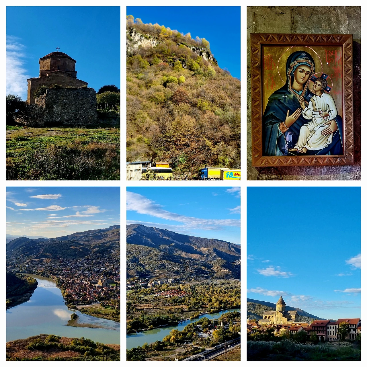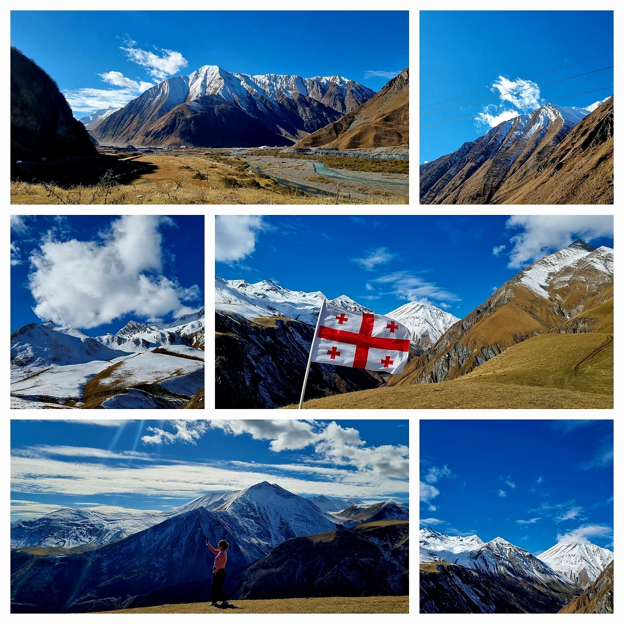 어제 오후에 왔던 길을 그대로 달렸다. 즈바리협곡은 내리막길에서 보다, 오르막길에서 바라보는 경치가 훨씬 웅장했다. 청명한 날씨지만 고산 폭풍에 하얀 구름이 흩어져서 협곡 너머 설산 봉우리를 스쳐가는 모습이 장관이다. 차안에서 연신 사진을 찍고, 동영상으로 연도의 경치를 찍었다. 어제처럼 2,379m 산마루를 넘어서서 내리막길로 들어섰다. 이제 도로는 좌우로 요동치면서 빙빙 돌기 시작한다. 잠시 후 계곡 건너편에 구다우리 전망대가 보였다. U자로 깊이 꺾이는 길모퉁이에 차량 몇 대가 주차되어 있기에 잠시 서서 구경하고 가자고 우연히 들어간 곳이 대박이었다. “Oh, My God!”하는 탄성이 절로 나오는 천하절경을 감상할 수 있는 지점이었다. 어제 보았던 ‘악마의 계곡’, 무시무시한 단애가 우리가 서있는 언덕과 앞산을 깊이 갈라놓았고, 높은 산 뒤로 숨은 태양에서 발산되는 햇살이 화살처럼 쏟아져 내린다. 우측으로는 한점의 얼룩도 허용치 않고 서 있는 단아한 이등변 삼각형 설산을 중심으로 여러 높은 산들이 겹겹이 도열해 있다. 뒷산 방향으로는 S자 모양 도로가 예닐곱 줄 겹쳐서 펼쳐져 있고, 그 위로 끊임없이 대형 컨테이너 트럭들이 오르내리고 있다. 왼쪽 아래로는 어제 들렀던 구다우리 전망대의 말굽형 조형물과 계곡 위를 날아다니는 패러글라이더들이 바라다 보인다. 까마득한 계곡 저 아래로는 동그란 호수가 거울처럼 가을하늘을 담고 있다. 늦가을의 언덕엔 한여름의 태양에 누렇게 타버린 잔디가 깔려있고, 중간에 있는 작은 둔덕에 흰 바탕에 5개의 붉은 십자가가 새겨진 조지아 국기가 펄럭이고 있다. 사방 봉우리는 다 설산이니, 어디를 둘러봐도 감탄을 금치 못할 명승(名勝)이다, 문득 강릉 경포대에서 고개를 갸웃거리며 읊던 송강 정철의 가사가 생각난다. “이도곤 가잔데 또 어듸 잇단 말가?” 그래 바로 이 곳이로다. 계곡풍과 고산풍이 마주치는 장소이기에 필시 거센 바람이 몰아치기 십상일텐데 오늘따라 바람도 잔잔하고, 날도 맑고 온화하다. 아내와 딸도 영화 『Sound of Music』의 Julie Andrews처럼 자유를 만끽하는 자세로 빙빙 돌며 사진을 찍었다. 나는 마치 십자군 전사인 양, 조지아 국기봉을 한 손으로 잡고 무릎을 꿇은 엄숙한 자세로 사진을 찍었다. 내 생애 최고의 절경중 하나를 칠순여행에서 마주쳤으니 이것만으로도 충분하다.