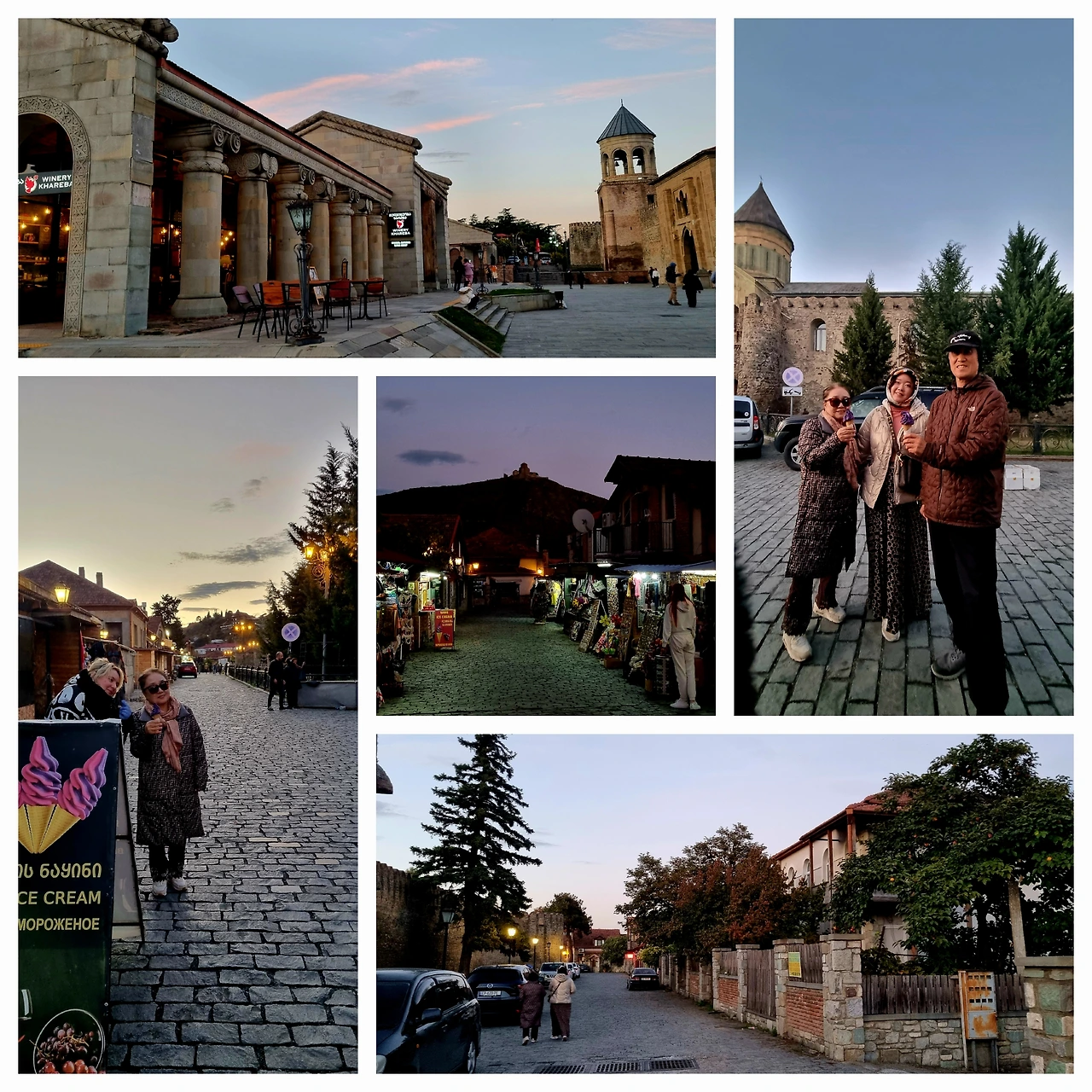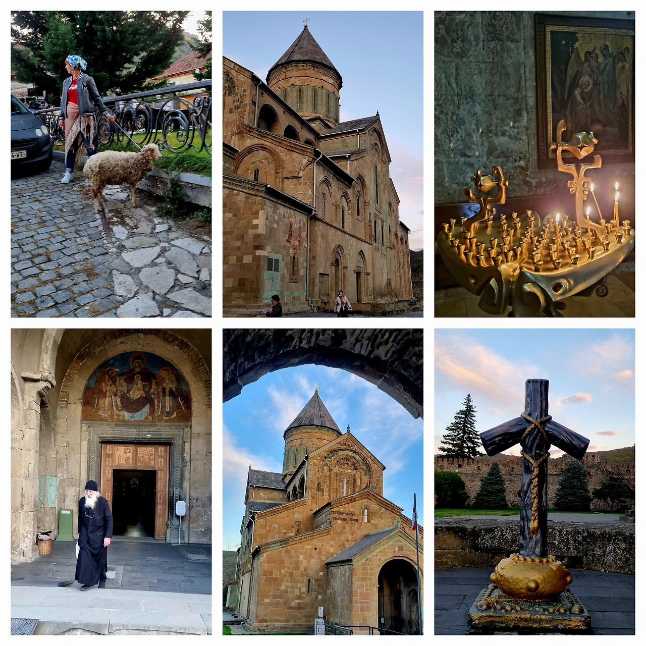 무츠헤타 마을 안쪽까지 차를 몰고 와서 성당 외벽에 주차하고 경내로 들어갔다. 강아지 대신 양을 목줄 매서 교회 잔디밭에서 풀을 먹이는 분들이 눈에 띈다. 조지아를 대표하는 성당답게 성당 구내도 건물 내부도 넓고, 높았다. 어두침침한 본당 안에는 참배객들과 집전행사에 참여하고 있는 예배 인파들로 붐볐다. 세월을 반영하듯 한 때는 화려했을 벽화들도 많이 탈색되고 벗겨진 것들이 많다. 그러나 새로 단장한 성전보다 차라리 이런 고풍스러움이 신앙의 깊이를 보여주는 듯 경건하게 느껴진다. 이 성당의 벽화들은 성경 다니엘서 7장 9절에서 묘사되고 있는 “옛적부터 계시던 분”을 형상화한 것이라고 한다. 성전 정면, 세겹으로 파인 제단(sanctuary)에는 초기 기독교 화풍처럼 동그란 눈을 가진, 성경을 펼쳐 들고 앉아 있는 예수님의 엄청나게 큰 전신 좌상 그림이 성전 전체를 압도하고 있다. 예수님 위의 천정 그림은 날개달린 아기 천사들이 불길 속에 앉아서 예수님을 옹위하고 있는 모습이다. 다른 그림들처럼 이 성화들도 오랜 세월 향초의 그을림에 찌들어서 전체적으로 시커먼 색조가 배어 있었다. 통나무집 모양으로 만들어진 성당 안 기둥에는 성니노와 삼나무 공중부양 장면이 성화로 그려져 있고, 푸른색 그림으로 장식된 작은 제단 아래에 그 옷이 묻혀 있다고 한다. 얼마나 많은 왕들이 이곳을 영면장소로 택했는지, 바닥에는 역대 조지아왕들의 무덤이 빼곡하게 안장되어 있었다. 죽은 이들은 말이 없다. 살아생전에는 어디 감히 얼굴이라도 똑바로 쳐다 볼 수 있었으랴만, 오늘은 송구스럽지만 당신들의 몸을 밟지 않고는 건널 수가 없군요. 한쪽 애프스에는 예루살렘 성전의 모형이 설치되어 있었고, 괴기스럽게도 예수의 12제자 중 한명인 안드류의 잘린 발이 금동모형으로 보관/전시되어 있었다. 대부분의 조지아인 참배객들은 그윽한 표정으로 성물을 바라보고, 간절한 모습으로 기도하고 있지만, 영문 모르는 나는 감동이 없다. 성화, 성물보다 그런 참배객의 모습을 바라보는 것이 더 신기했다. 다른 곳에서는 이런 데까지 신경 쓰지 않던데, 내가 가 본 어느 성당보다 촛불제단들의 조형장식이 아름다웠다. 아내와 딸은 또 한번 진지하게 기도를 드린다. 밖으로 나와서 벤치에 앉아서 성당건물을 원경으로 관찰하였다. 어둑해 지는 저녁하늘에 우뚝 솟은 황색 사암으로 만든 고색창연한 성당은 화려하진 않지만 조지아양식의 절제된 균형미가 느껴졌다. 입구에서 바라볼 때 우유곽같은 오각형 건물이 세겹으로 겹치게 건축되었고, 그 위로 원추형 돔이 정중앙에 우뚝 선 구조다. 역사를 읽어보니 수난도 많았다. 티무르대제의 침공으로 부서진 것을 14세기 말에 재건축하였고, 18세기에는 외적을 막기 위해 방벽을 설치했다. 1830년대에는 러시아 짜르(황제)의 방문을 기해 북, 서, 남쪽에 있던 낡은 갤러리를 철거하고 오래된 벽화 위로 흰색 페인트를 도색하였다고 한다. 지금 기준으로는 어처구니없는 처사다. 현재의 벽화들은 1950년대부터 1970년대 사이에 흰 페인트를 벗겨내고 복원한 것이라고 한다. 성당 너머 산꼭대기에 방금 다녀온 즈바리수도원이 석양빛을 받아서 자그맣고 빨간 장난감 집같이 얹혀져있다. 경내를 벗어나자 벌써 어둠이 깔려있었다. 가로등 불빛을 받은 고도(古都) 므츠헤타의 길거리에, 또 지붕 위에 석양빛이 감도는 초저녁의 분위기가 가득하다. 교회뿐 아니라 도시 전체가 유네스코 문화유산으로 지정된 유서 깊은 장소다. 생각해 보니 카즈베기에서의 아침 식사 이후 하루 종일 먹은 것이 없다. 분위기 좋은 이 마을에서 식사를 하면 멋지겠지만, 여행 사령관은 단호했다. 오늘밤 숙소가 1시간 거리의 고리(Gori)란 곳이니 더 늦기 전에 출발해야 한다고 선언한다. 아쉽지만 그 지시를 따르지 않을 수 없다. 그 대신 한국말로 인사를 건네는 노점상 여주인에게서 아이스크림을 사서 므츠헤타의 달콤한 맛을 음미하며 마을을 떠났다.