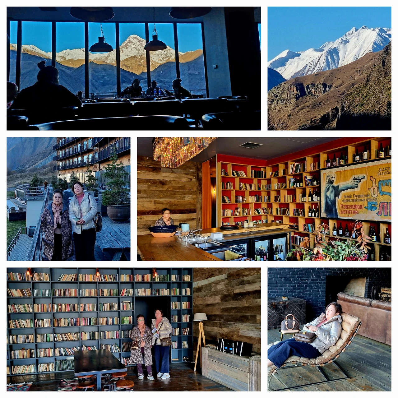 여행 닷새째. 아침 식사하러 8시쯤 식당으로 갔다. 창가 자리는 벌써 일찍 출발하는 단체관광객들이 차지해서 왁자지껄하다. 새벽같이 출발하는 단체 관광객의 대명사는 역시나 한국인 들이다. 허겁지겁 밥을 떠먹곤, 말타고 다니는 유목민처럼 순식간에 사라졌다. 우린 천천히 여러 가지 음식을 즐겼다. 역시 좋은 호텔이라서 조식 뷔페 차림새도 만만치 않다. 가난한 나라 키르기스스탄에서 맛보지 못한 음식과 차려진 과일, 과자와 빵까지 아내는 연신 칭찬을 아끼지 않는다. 식당 안에도 큰 개 한 마리가 들어와서 어슬렁거리고 있다. 투숙객들도, 호텔 직원들도 애써 쫓아낼 생각을 하지 않는다. 워낙 순한 녀석이다. 1시간 이상 앉아서 통 창에 가득 담긴 설산 경치를 감상하며 키르기스스탄에서 맛보기 힘든 스페셜티 커피까지 우아하게, 그리고 충분히 아침식사를 즐겼다. 식사 후에 호텔 앞 베란다와 도서관처럼 꾸며진 벽난로 있는 휴게실, 당구대 등을 살펴보며 하나도 즐기지 못하고 하룻밤 잠만 자고 떠남을 아쉬워했다. 카즈베기산은 아침 햇살을 받아 붉게 빛나고 있다. 푸른 가을하늘에 솟아오른 삼각형 봉우리가 황혼녘과는 또 다른 풍광을 선사하고 있다. 위대한 장군의 기상처럼 당당한 모습으로 푸른 하늘을 배경으로 우뚝 서있다. 체크아웃하고 차로 가보니 앞 유리창에 서리가 두껍게 껴있다. 역시 산속 마을이라서 기온이 무척 낮았다. 컨디션을 회복한 사령관이 다시 운전대를 잡았다. 이후 모든 여정에서 사령관이 운전을 도맡아 했다.