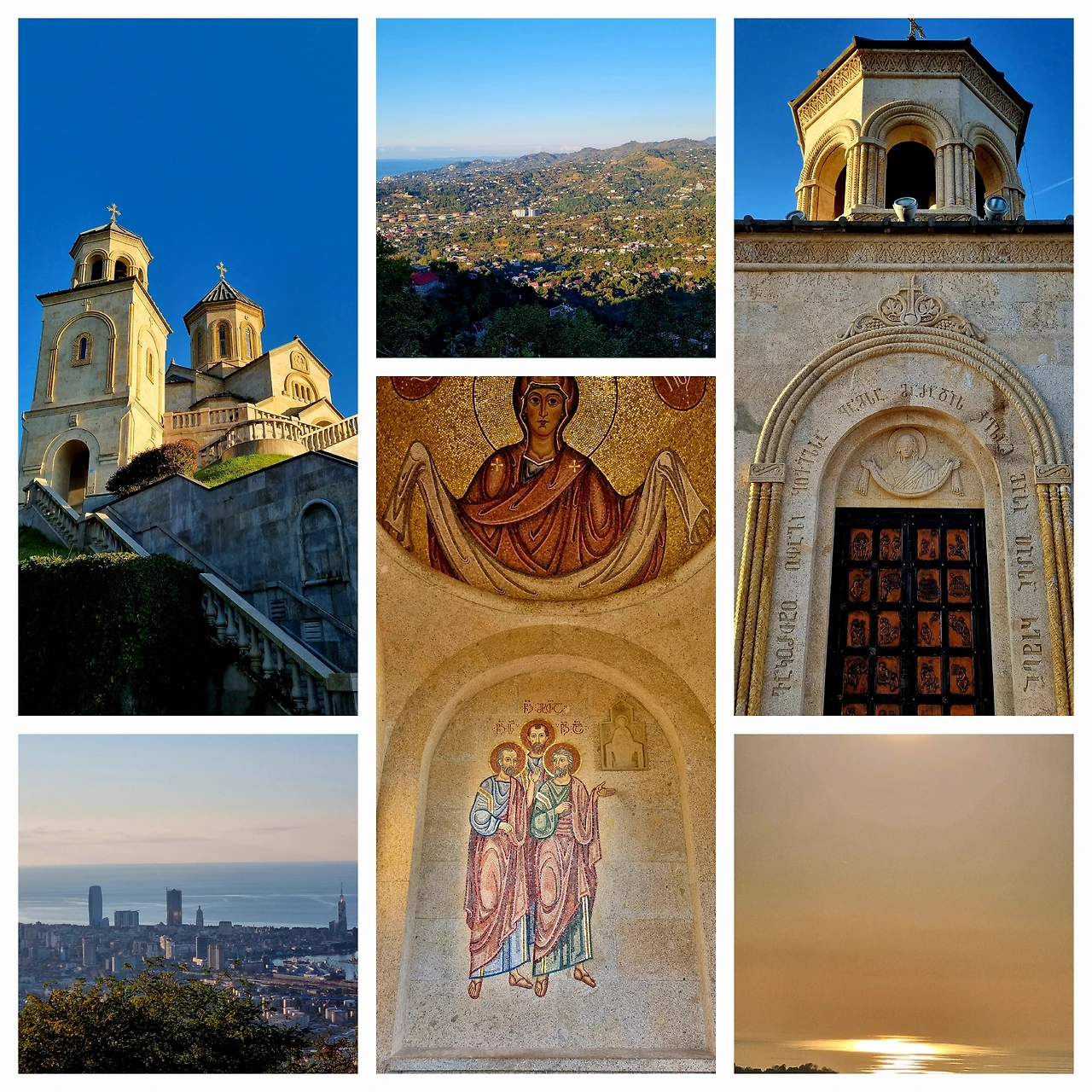 사령관이 케이블카를 타고 산 위 전망대에 오르는 방법도 있지만 우리 차로 그보다 더 높은 산위에 있는 수녀원엘 가자고 한다. Good Idea! 도심에서 동북쪽 방향의 뒷산으로 향했다. 멀리서는 보이지 않더니 산 속에는 의외로 많은 단독주택들이 숨겨져 있었다. 꼬불꼬불한 길을 한참을 올라가서 다시 숲속 길 몇 굽이를 돌고 나니 절벽 위에 자그마한 주차장이 보인다. 도심 기준 약 10km, 수산시장에서 20분쯤 운전해 온 셈이다. 차를 세우고 엉성한 철문으로 막아 놓은 경내로 들어서서 다시 울창한 숲길을 7-8분 걸어 올라가서야 교회가 있었다. 조지아 말로 성삼위일체인 사메바(Sameba) 교회는 아자라-구리아 산맥 외곽의 해발 400m 작은 봉우리 산마루에 한 송이 장미처럼 오똑하게 서있다. 바투미시와 광활하게 펼쳐진 흑해가 한 눈에 내려다보이는 명당이다. 굽어보노라니 저 아래 케이블카 종점 전망대가 손톱만하게 보이고, 콩알만한 케이블카가 무궤도열차인 양 공중에서 일직선으로 천천히 움직이고 있다. Breathtaking!! 수산시장에서 맺혔던 답답한 마음이 싹 사라지는, 가슴이 시원해지는 탁 트인 전망이다. 교회는 웅장하기 보다는, 조지아식 삼각형 지붕의 균형미를 갖춘 단아한 건물 2채로 구성되어있다. 세월의 흔적이라곤 전혀 느낄 수 없는 깔끔한 외관의 교회다. 그러나 교회의 성장사는 문자 그대로 역경(逆境)이었다. 교회는 19세기 중반에 신축되었지만, 1877년 러시아-터키 전쟁 중 오토만터키 제국 군대에 의해 폭파된 후 70년동안 농산물 저장창고로 방치되었다고 한다. 1947년에야 다시 교회로 사용되기 시작하였으나, 1976년 화재로 전소되어 버린다. 그리고 4반세기가 지난 후, 2002년에야 러시아에 사는 조지아 출신 사업가의 재정지원에 의해 현재의 교회와 수녀원이 건립되었다. 수녀원의 부속 교회로 사용되고 있어서인지, 본당 안 정면에는 금빛 바탕에 자주색 드레스를 걸치고 두 손을 벌려 환영하는 비잔틴 양식의 성모 마리아상이 크게 그려져 있다. 벽면의 그림들도 전체적으로 금색이 주를 이루어 화려면서도 깔끔한 느낌이다. 놀랍도록 아름다운 벽화들로 가득한 예배당이다. 그러나 사진촬영이 금지되어 있어서 눈으로 감상할 수밖에 없었다. 입구에 나이 지긋하신 서양인 수녀님이 오가는 관광객들에겐 무심한 척 경건한 모습으로 기도서를 읽고 계셨다. 교회 안 기둥 뒤에서 살짝 촬영을 하지 못할 바가 아니었으나, 그 거룩하신 모습을 거스려서는 안될 것 같기에 아예 사진기를 꺼내지 못했다. 대신 본당 입구 출입문에 새겨진 예수님의 12제자의 조각상, 두 교회 사이 회랑 돔 천정에 그려진 금빛 성모 마리아상과 그 아래의 베드로, 요한, 바울 3성인의 금빛 성화를 감상하고, 사진을 찍을 수 있었다. 이제 서쪽 방향 흑해 위로 태양의 그림자와 벌건 윤슬이 드리우기 시작한다. 얼마 후에 저녁놀이 피어오를 조짐이다. 서둘러 내려가서 힐튼호텔 스카이라운지에서 일몰을 감상하기로 했다.