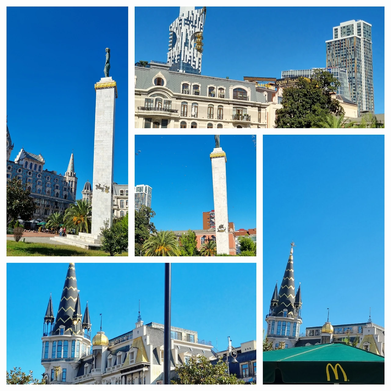 길을 건너서 구시가지로 들어섰다. 이곳은 건축물 애호가들에겐 숨겨진 보물이다. 바투미의 역사를 반영하듯 터키식, 러시아식, 그리스식, 서유럽식 등 다양한 건물들이 산재해 있다. 19세기 러시아인들이 대거 이주하기 전까지 오토만 치하에서는 상당수의 네덜란드인과 벨기에인들이 살았던 구역이라고 한다. 골목길을 따라 들어가니 오래된 이태리 도시 광장에 있을법한 삼각형 지붕의 멋진 시계탑 건물이 보인다. 언뜻 보면 유럽 시계탑 건물의 원조격인 이태리 시에나의 시계탑을 연상시키나 붉은 벽돌에 유리창문이 혼합되어 훨씬 현대적으로 재해석해서 지은 시계탑이다. 시계탑 건물 앞으로 전체 약 5,700 제곱미터(약 1,800평) 정도의 광장을 멋진 레스토랑, 카페 등이 둘러싸고 있다. 여기가 피아자 광장(Piazza Square)이란다. 뭐야? 이태리어와 영어의 동어반복이잖아? 광장 한켠에 가설무대가 설치된 모양새가 밤이 되면 전자기타와 드럼의 굉음과 더불어 무언가 시끌벅쩍한 라이브 공연이 열릴 것 같다. 분위기는 꽤 오랜된 느낌인데 바자 오르벨라제(Vazha Orbeladze)란 현지 건축가가 베니스의 건축물에서 영감을 받아서 디자인하고 2010년에 개장했다고 한다. 아하~ 그래서 광장 이름이 이태리어로 광장인 Piazza를 사용하는구나. 그래 그러고 보니 베네치아의 산마르코 광장에 있는 깜빠닐레(Campanile) 시계탑에 더욱 가깝게 느껴진다. 비록 높이는 반밖에 안되어 보이지만... 광장 바닥 한가운데엔 직경 10m 크기의 유럽에서 가장 큰 인물 모자이크 원형 대리석 작품이 있다. 중앙에 인어가 그려져 있고 이를 둘러싼 5개의 원안에는 빨강, 파랑, 자주, 분홍, 초록색 옷을 입은 바다의 신들이 장식되어 있으며, 가장 외곽에 있는 8개의 둥근 원은 바투미를 둘러싸고 있는 온 세상의 평온한 바다를 상징하고 있다. 항구도시의 이미지를 잘 형상화한 작품이다. 우리에게 안 알려져서 그렇지 이곳은 이미 ‘리틀 이태리’란 별칭으로 꽤 유명한 공연장소였다. 플라시도 도밍고, 스팅 등 세계적인 가수와 팝스타들이 와서 공연을 한 곳이라고 한다.