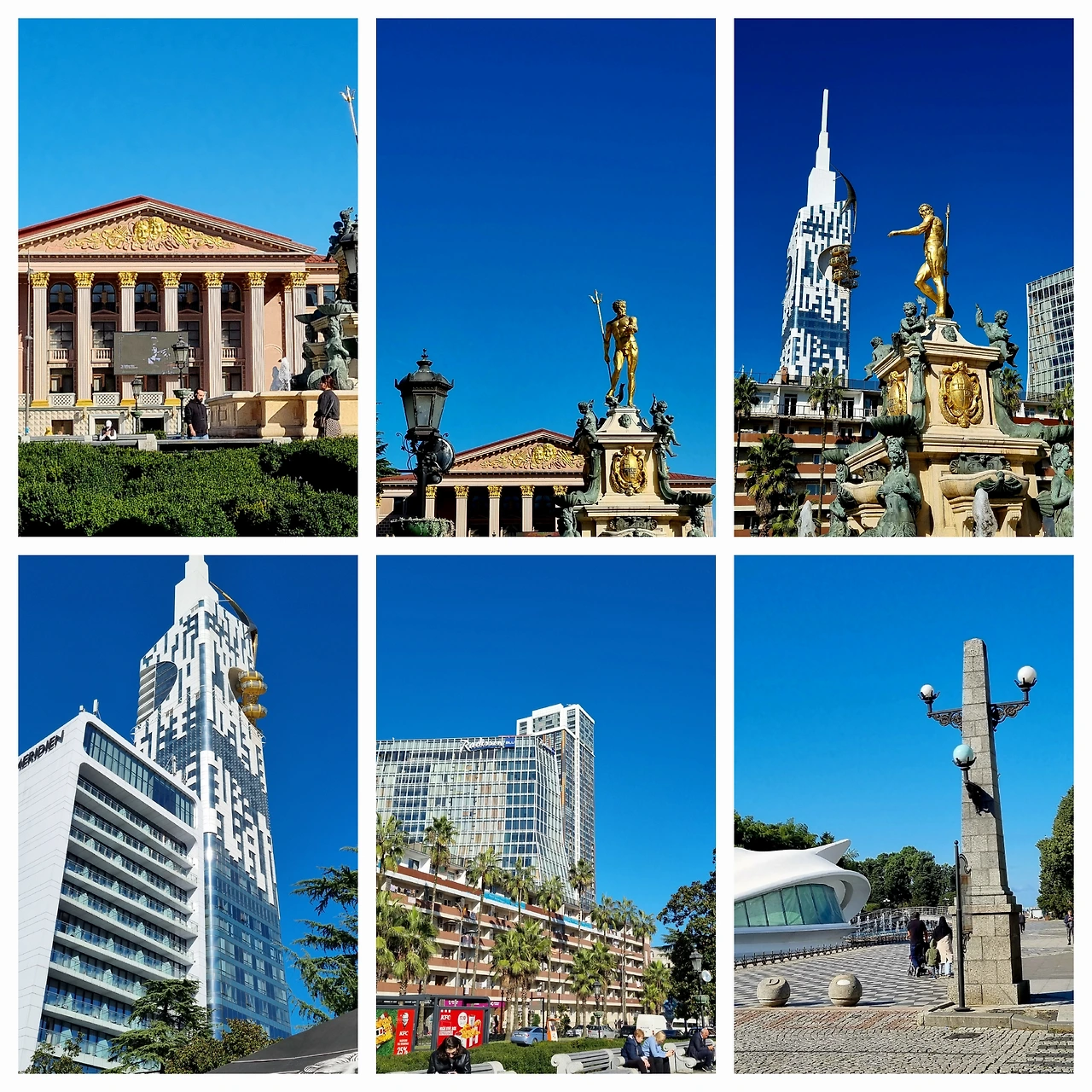 사각형 유럽광장의 꼭지점 부근과 연결된 또 하나의 광장으로 들어서자 광장 끝으로 그리스 신전을 연상시키는 코린트식 기둥들로 입구를 장식한 단아한 오페라하우스와 잘 가꾼 정원이 보이고, 광장 한가운데에 정교한 장식의 멋진 분수가 자리하고 있다. 그리스 신화 속 바다의 신 포세이돈에 해당되는 로마의 신 넵튠(Neptune)을 형상화한 분수다. ‘유럽광장’이 그리스 신화의 공간이라면, 이 곳은 로마 신화의 공간이다. 물의 신인 넵튠은 웬만한 유럽도시 중심부 분수대의 단골소재다. 로마, 마드리드, 베를린, 플로렌스, 베르사이유 궁전까지... 분수대 한가운데 울퉁불퉁한 근육질의 넵튠이 삼지창을 꼬나 든 채 근엄한 표정으로 서있고, 물줄기 뿜어져 나오는 사이사이로 늘씬한 나체의 인어공주들이 그 주위를 둘러싸고 있는 구조니 얼마나 세속적 욕망과 잘 어울리는 분수인가? 바투미의 분수도 넵튠과 사방벽에 설치된 방패를 금빛으로 도장하여 문자 그대로 화려하다. 그러나 이 분수는 르네상스 후기 1566년에 완공된 이태리 볼로냐의 넵튠분수대를 모방한 작품으로 2010년에 완성된 것이기에 독창적 예술품으로서의 가치는 높다고 볼 수 없다. 그러나 금빛 창을 꼬나 든 넵튠의 뒷 배경으로 금빛 회전전망대가 설치된 바투미 최고층 빌딩 ‘르 메르디앙호텔’의 뾰쪽한 첨탑이 겹쳐 보이면서 연륜만 뽐내는 유럽 도시의 낡은 분수대보다 훨씬 신선한 아름다움을 자아내고 있다.