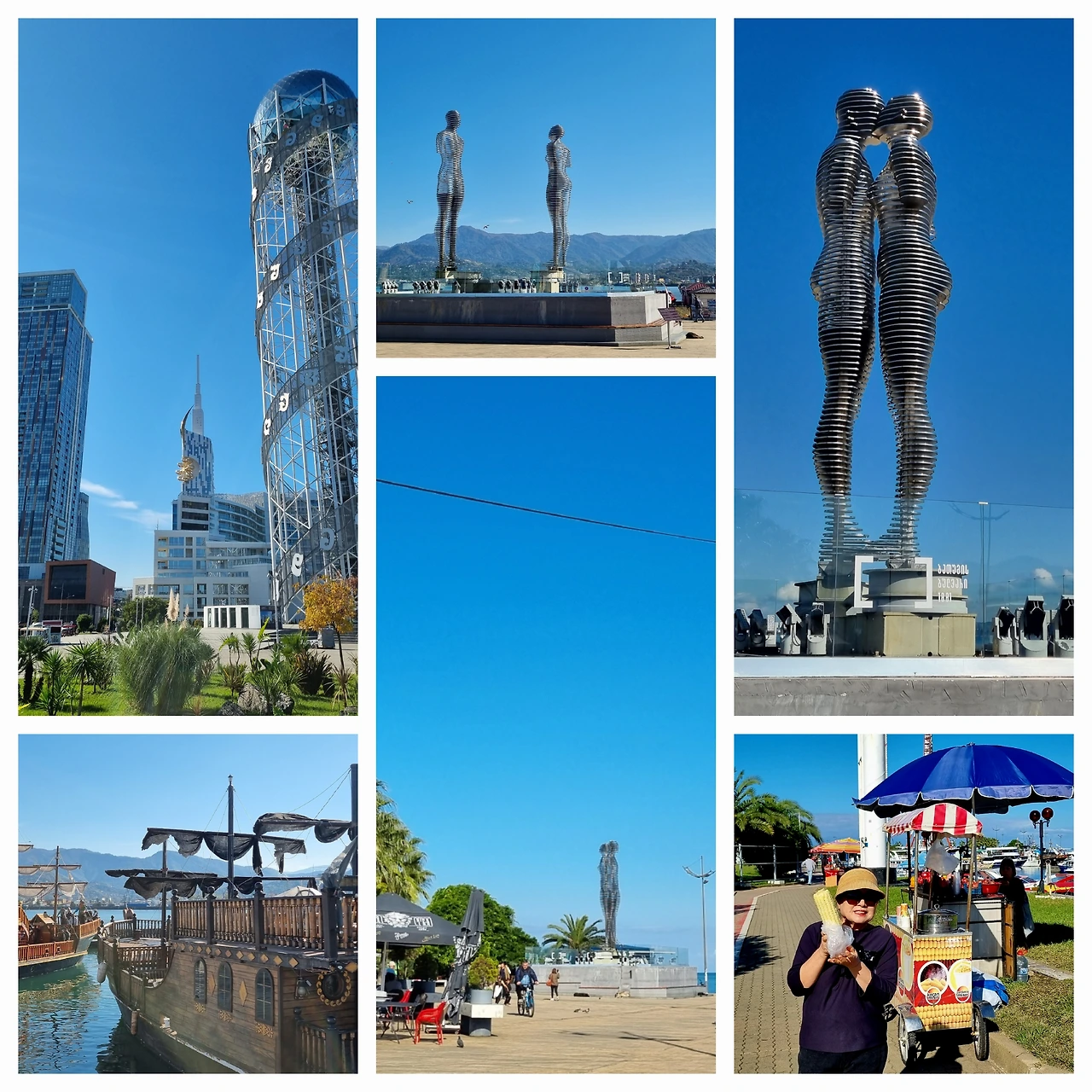 해변공원을 따라 포토존으로 활용될 수 있는 재미있는 조형물들이 많이 설치되어 있다. 사진 찍는 재미가 쏠쏠해서 걷는 피곤함을 느끼지 못하겠다. 바다로 돌출된 곶(串)까지 왔다. 북쪽 해변으로 흑해의 해안선이 들쑥날쑥 겹쳐져 보이며 울창한 숲과 현대식 건물들이 조화를 이루어 아름답고 풍요로운 광경을 연출하고 있다. 우측으로는 바투미 구시가지가 한눈에 바라다 보이는 장소다. 역시 초현대식 디자인의 늘씬한 고층빌딩들이 즐비하다. 이 돈이 다 어디서 나왔단 말인가? 아마도 러시아와 터키 부호들이 투자한 것이 아닐까 추측된다. 글자라기 보다는 도형에 가깝게 생긴 조지아 알파벳 33개를 모아서 구성한 ‘글자탑’을 지나자 바투미에서 가장 유명한 조형물이 보인다. 바로 ‘사랑의 탑’이라고 불리는 ‘알리와 니노’의 움직이는 조각이다. 아제르바이잔 작가 쿠르반 사이드의 소설 주인공인 아제르바이잔 귀족 출신의 회교도 알리와 기독교도인 조지아 공주 니노 사이의 사랑 이야기를 형상화한 조각품이다. 은빛 금속파이프로 미로의 비너스상 모양의 8m크기의 남녀를 만들고 이 둘이 10분 간격으로 각각의 궤도를 공전하면서 서로 겹쳐졌다가 멀어지기를 반복하는 모바일이다. 국적과 종교를 넘나드는 두 남녀의 사랑의 여정, “짧은 만남, 긴 이별”을 조각으로 형상화한 것이다. 조지아의 여류 조각가인 타마라 크베시타제 (Tamara Kvesitadze)의 2010년 작품이다. 역시나 잘 조성된 해변공원을 끼고 걷다가 한굽이 돌자 작은 요트들이 정박해 있는 마리나가 나온다. 길가 노점상인이 솥단지를 걸고 옥수수를 팔고 있다. ‘옥수수 귀신’인 집사람이 그냥 지나칠 리 없다. 5라리(약 2,500원)를 주고 솥에서 꺼내 준 옥수수는 가히 내 팔뚝만하다. 내 평생 본 옥수수 중에서 가장 큰 것 같다. 거대한 옥수수를 쥐어들고 함박웃음을 짓는 아내를 보니 나도 행복해 진다. 그러나 맛은 우리나라 찰옥수수의 쫀득한 맛을 따라가지 못하노라고 품평한다.