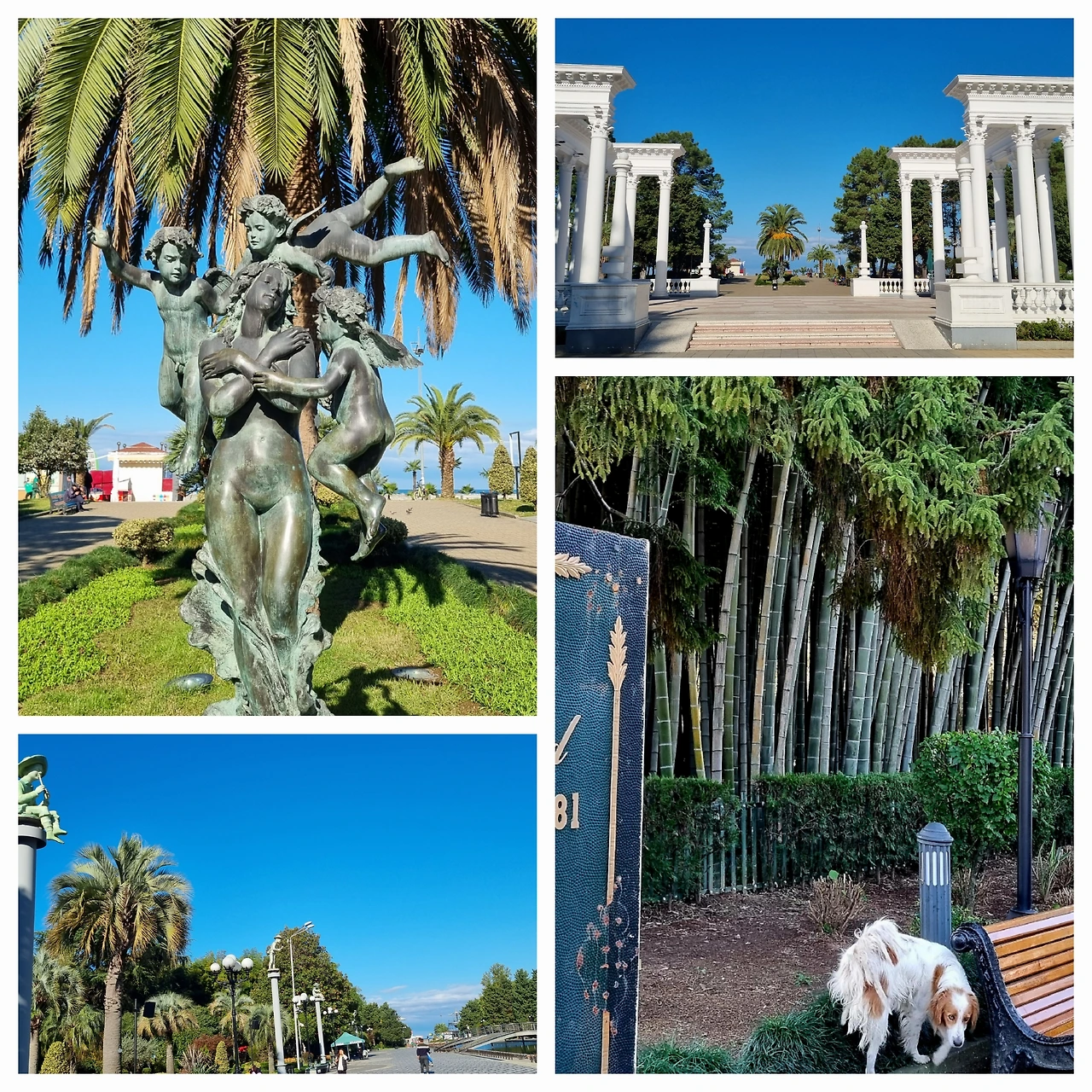 10시, 차를 몰고 나가서 인근 바닷가 공원 앞 길가에 세우고 걷기 시작했다. 멋진 해변공원이 펼쳐져 있다. 넓직한 잔디밭과 숲 사이로 돌고래 모양의 조각상이 있는 화려한 분수, 각종 조각상이 얹어져 있는 그리스식 기둥들, 한 구역 가득 빽빽이 자라나는 엄청 굵고 높은 대나무 숲 단지, 등등. 어떻게 이렇게 도시계획을 잘해놓았는지 놀라울 지경이다. 100미터 이상의 바닷가 넓은 해변을 자연 그대로 훼손하지 않은 채로 보전한 상태에서 폭 5미터 넓이의 보행자 전용 도로를 만들고, 그 다음 약 30미터 폭의 숲이나 잔디를 조성한 후, 약 3미터 넓이의 자전거 전용도로가 있고, 다시 폭 10미터쯤의 숲이나 잔디가 있고, 그 다음에야 2차선 차량전용 도로가 설치되어 있다. 건물은 그 다음에서 시작한다. 군데군데 폭 100미터는 됨직한 나들목 공원이 길을 가로지르며, 그 위에 각종 예술품이 전시되어 있다. 놀랍다. 그리고 말도 안된다. 내 평생 어느 선진국에서도 이렇게 잘 조성된 해변공간을 구경하지 못했는데, 코카서스 변방 약소국의 소도시에 어떻게 이런 멋진 해변공원이 있을 수 있단 말인가? 삼천리 반도 모든 해변마다 바닷속으로 파들어 가면서까지 횟집, 여관, 상점, 축대로 (요즘은 멋진 카페가 들어서는 추세라서 그나마 다행이지만) 뺑둘러 쌓여진, 완전히 망가진 우리나라의 해변을 보고 개탄을 금치 못했던 내겐 정말 경이로운 항구도시다. 같은 흑해라도 지난 해 가본 터키의 오르두(Ordu)에서는 질퍽한 진흙해변이었는데, 바투미 비치는 몽돌해변이다. 어디서 흘러 들어온 돌들인지 파도에 씻기고 닳아서 동글동글, 보기도 예쁜 수억개의 자갈들이 해변가 전체를 눈길 닿는 데까지 뒤덮고 있다.