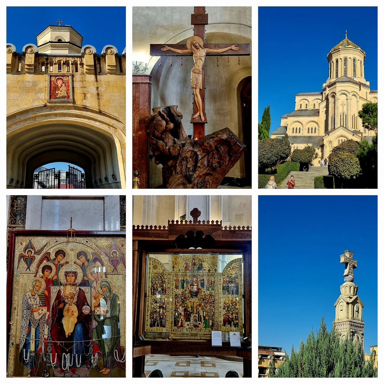 올라왔던 길을 되돌아서 산 아래로 내려온 후 다리를 건너 도심 동쪽 아르메니아인들의 집단거주 지역이었던 엘리아힐(Elia Hill) 언덕으로 꼬불꼬불 가파른 길을 따라 한참을 올라갔다. 동네 한복판 저자거리 같아 보이는 허름한 구역에 갑자기 큰 성문이 나타난다. 그 앞에 주차를 하고 철문을 통과하자 눈앞이 확 트이는 공간이 나타났다. 수십개의 계단 위 언덕에 호박색의 웅장한 교회가 우뚝하다. 조지아 말로 ‘사메바(Sameba)’라고 부르는 ‘성삼위일체 대성당(Holy Trinity Cathedral)’은 현재 조지아에서 가장 큰 성당으로 조지아정교회의 대주교 성당이다. 그러나 그 역사는 불과 20년에 불과한 새 성당이다. 성당 터는 원래 아르메니아 교회와 공동묘지가 있던 땅인데, 독립국 조지아의 정신적 지주가 될 큰 성당을 짓자는 취지하에 1995년에서 2004년 사이에 기업인들과 국민들의 성금으로 건축되었다고 한다. 사메바 성당은 여러 가지 면에서 지난 1,500년동안 조지아정교회의 중심성당이었던 스베티츠코벨리 성당을 현대적으로 재해석한 것이다. 스베티츠코벨리 성당처럼 입구에서 보면 오각형 건물이 세겹으로 겹쳐 보이고, 그 위로 원추형 돔이 솟아 있는 십자가 형태의 전형적인 조지아 양식의 건물이다. 길이 70.4m, 넓이 64.7m로 스베티츠코벨리 성당(57.7m x 27m x 49m)에 비해 훨씬 더 큰 성당이다. 특히 황금빛 돔의 높이가 87.1m로 멀리서 보면 수직형 건물처럼 보인다. 내부(56m x 44m)는 동시에 10,000명이 예배를 드릴 수 있는 큰 규모다. 대성당은 9개의 예배당(chapel)을 갖고 있고, 그 중 5개는 지하 예배당이다. 지하 예배당도 층고가 13.1m로 4층 건물 높이의 트인 공간이기에 지하예배당의 답답함을 느끼지 못하게 설계되었다. 이 성당의 건축학적 특이점은 십자구조의 건물의 교차점에 8개의 높은 기둥으로 떠받쳐진 원형 돔이다. 원형돔은 두쌍의 기둥이 형성하는 4개의 애프스(apse, 파인 공간)와는 구분되어 완벽한 원형으로 올려다 보이고, 12개의 창문 안으로도 또 하나의 동심원이 형성되어 전체적으로 완벽한 대칭미를 보여주고 있다. 높이 솟은 원형돔을 올려다보면 마치 바르셀로나 ‘성가족(Sagrada Familia) 성당’ 내부의 기둥을 올려다 볼 때처럼 신비한 느낌을 준다. 그러나 성가족성당의 기둥들이 약간씩 기울어서 서로 지탱하면서 묘한 불균형의 아름다움을 보여주고 있는 반면, 성삼위일체성당의 중앙돔은 완벽한 수직대칭 구조로 안정적인 균형의 미를 보여주고 있다. 중앙 제단의 그림도 스베티츠코벨리 성당의 예수상처럼 맨발의 전신좌상이다. 그러나 오른손 검지와 중지 두 손가락을 위로 펼친 채 손을 들고 있는 모습이다. 그 아래에는 성모 마리아와 예수의 제자들의 그림이 그려져 있고, 제단 앞에는 다채로운 여러 성상들의 성장(聖障, iconostasis)이 병풍처럼 앞을 막고 있었다.