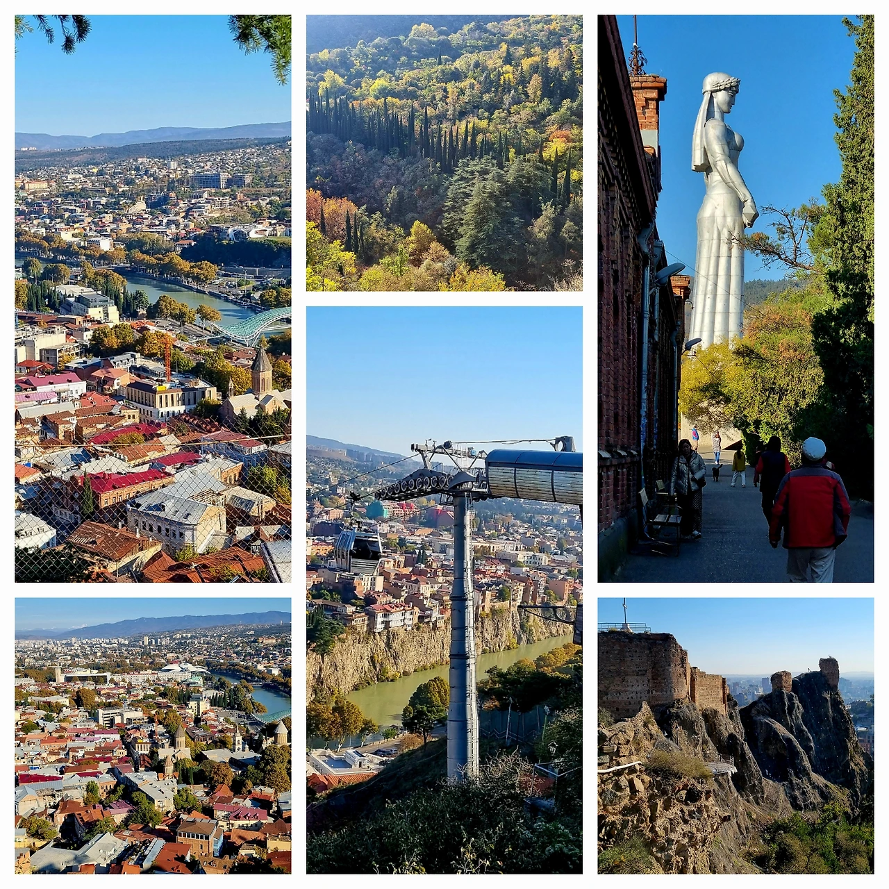 조각상을 지나 능선길을 따라 케이블카 종점 방향으로 걸어가면서 바라보는 사방의 경치가 매우 수려했다. 눈 아래 트빌리시 구도심에는 20세기 초반에 지은 아르누보(Art Nouveau) 양식 건물들의 붉은 지붕이 군데군데 퍼져있고, 그 사이로 조지아 양식의 원추형 교회첨탑들이 삐죽삐죽 솟아있다. 북쪽 방향으로 펼쳐진 먼 도심에는 현대식 고층건물들이 우뚝우뚝 솟아있다. 그 중 한 건물은 서울 삼성역에 있는 무역센터 건물을 옮겨 왔나 싶게 생김새가 거의 유사하다. 강 건너 맞은 편 언덕으로는 황금빛 돔을 가진 대성당이 웅자를 자랑하고 있고, 그 아래로 대영박물관 건물같이 생긴 돔을 가진 웅장한 건물이 강가에 있다. 더 아래 강줄기가 휘어져 가는 절벽 위에는 고색창연한 교회도 서있다. 도시 중간으론 쿠라강이 뚜렷한 S자를 그리며 흐르고 있다. 그 근처에서 출발하는 케이블카가 축 늘어진 포물선 위에 대롱대롱 매달려 산 위 아래를 숨가쁘게 오르내리고 있다. 오른쪽 더 높은 산 위론 일부는 이미 허물어졌지만 남아 있는 구조물만으로도 거대한 성채가 있다. 나리칼라(Narikala)성이다. 그 위로도 날렵한 교회건물, St. Nicholas 성당이 보인다. 성채로 올라가면 더 멋진 경치를 볼 수 있다고 하던데, 보수공사중이라서 관광객들의 출입을 허용하고 있지 않으니 아쉬웠다. 오른쪽으로 시선을 돌리자 숲으로 뒤덮인 푸른 산이 병풍처럼 둘러있고, 그 아래로 검은 색조를 띈 깊고 가파른 계곡이 펼쳐져 있다. 이정표의 화살표가 ‘트빌리시 식물원’ 가는 방향이라고 가리키고 있다. 경인이 저 건너편 황금빛 돔을 가진 큰 교회를 가리키며, 이제 우리가 저 대성당을 찾아갈 것이라고 한다.