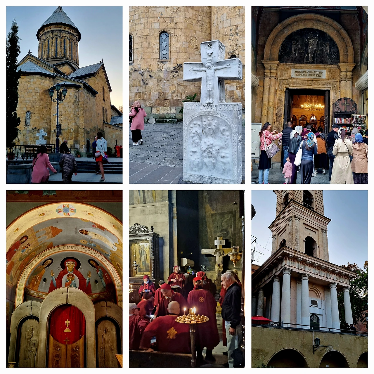 ‘평화의 다리’를 건너 다시 구도심으로 들어섰다. 멋진 벽화와 니노의 십자가의 유적으로 유명한 ‘트빌리시 시온성모영면교회(Sioni/Zion Cathedral of the Dormition of Tbilisi)’는 불과 5분 이내 거리에 있었다. 이 교회는 5세기 트빌리시가 수도로 건설되면서 세워진 최초의 교회였으나, 그동안 외적들의 침입 및 지진에 의해서 여러 번 파괴되고 재건축하는 과정이 되풀이 되었다. 현재의 성당은 13세기의 건물을 바탕으로 17세기에서 19세기 사이에 보강된 것이라고 한다. 성당의 모습은 전형적인 조지아 양식으로 원추형 돔(cupola)를 갖고 있지만 둥근 돔을 받치는 하부구조(tholobate)가 유달리 길고 16개의 정교한 장식으로 치장된 긴 창문을 갖고 있어서 외형적으로도 늘씬해 보일 뿐 아니라, 실내의 채광도 충분히 제공하고 있다. 이 성당은 2004년 ‘성삼위일체대성당’이 완공되기 전까지 조지아정교회의 중심성당이었다고 한다. 토요일 저녁 미사시간이라서인지 자그마한 교회에는 예배를 드리러 온 신자들로 가득했다. 여성들은 스카프로 머리칼을 숨기고 손을 모으고, 모두들 경건한 표정이라서 호기심 어린 동양인 관광객이 헤집고 다니며 구경할 분위기가 아니었다. 게다가 무슨 특별한 축일인지 카톨릭 추기경처럼 진홍색 복장(soutane) 차림의 사제들 10여명이 미사에 참석하여 기도송을 선창하고, 청중이 따라하니 그 분위기가 더욱 엄숙하였다. 그동안 가 본 조지아의 어느 교회보다 살아 있는 성당인 것 같다. 회중들 틈새로 기웃거리며 바라 본 성당은 소문대로 금빛 바탕 위에 중세풍의 특이한 그림이 벽면, 그리고 천정까지도 가득했다. 성당의 그림들은 중세시대의 그림과 1850년대 러시아의 장군이자 화가인 Knyaz Grigory Gagarin이 그린 연작 성화, 1980년대 조지아 화가인 Levan Tsutskiridze가 그린 벽화까지 뒤섞여 있는 일종의 성화 박물관이었다. 살짝 카메라를 켜고 동영상으로 실내를 촬영하다가 스스로 무안하여 10여초만에 중단하였다. 사람들 틈새에 끼어 부대끼는 것을 질색하는 사령관 동지는 진작부터 밖으로 나와서 벤치에 호젓하게 앉아 있었다.