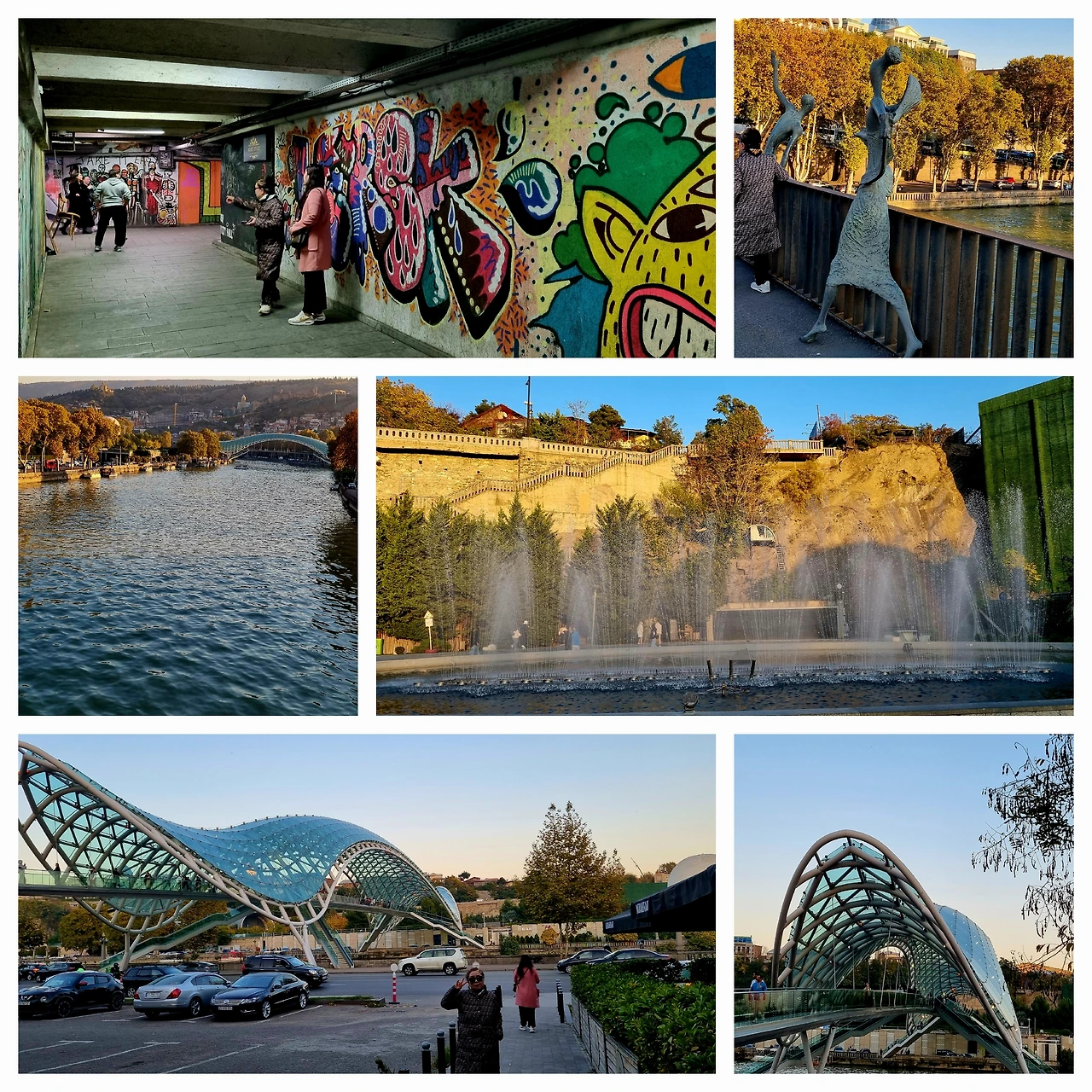 강 전면 언덕 위에 유리 돔과 그리스 신전같은 열주를 가진 웅장한 큰 건물이 있다. 찾아보니 한 때 대통령 관저로 사용되었던 건물로 현재는 ‘영빈관(State Palace of Ceremonies)’으로 사용하는 건물인 것 같다. 그냥 대통령 관저로 써도 충분히 호사스러워 보이는데, 새 건물을 마련해서 나갔단 말인데 이게 말이 되는 처산가 싶다. (나중에 알고 보니 대통령 관저는 좀 자그마한 옛 시인의 집으로 옮기고, 현재 영빈관은 대통령 집무실로 사용되고 있었다.) 강변을 따라 조성된 Rhike 공원도 엄청난 돈을 들여 트빌리시의 새로운 명소로 조성되었다. 들인 돈만큼 조경은 아름다웠다. 완만한 경사지형을 따라 2016년에 완공된 큰 나팔관같이 생긴 현대식 유리건물 두 동이 건설되어 있다. Rhike 음악당 및 전시관이다. 저명한 이태리 건축가인 Massimiliano와 Doriana Fuksas 부부가 디자인한 초현대식 건물이다. 그러나 완공한지 10년이 다 되어 가도록 거의 활용되고 있지 않아서 예산낭비의 전형적인 사례로 비판받고 있다고 한다. 건축학적으로는 초현대식 작품이고, 너무 멋진 외양의 건물들인데 이제는 관광객들이 먼 발치에서 사진 찍는 포토존으로만 활용되고 있었다. 우리가 갔을 때도 문이 닫겨 있었고, 군데군데 녹슨 자국이 역력하여 버려진 건물 같은 황량함이 느껴졌다. 2016년에 가 본 스페인 북부 바스크 지방, 인구 40만명이 채 안되는 빌바오에 있는 거창한 구겐하임미술관은 잘만 운영되고 있던데, 도시인구 125만명의 수도에 있는 문화공간이 어떻게 이렇게 버려진 건물이 되었을까 의아했다. 인구 400만명, 1인당 경상소득 8,800불(2024년) 정도의 약소국이 감당할 수 있는 예산 범위를 넘어서는 전형적인 ‘하얀 코끼리(white elephant)’ 사업, 정치인들의 허영이 빚어 낸 과시행정의 산물인 것 같아서 안타까웠다. 그런데 참 고약하다. 관광하러 온 작자가 “예쁘다!”하고 사진만 찍고 가면 될 것이지, 현장에서 웬 남의 나라 살림 걱정까지 하고 있는지 스스로 생각해도 한심하다. 나이 들어도 배운 도둑질은 속이지 못하는가부다. 언덕과 맞닿은 넓은 터에는 큰 분수대(Faggton Fountain)가 연신 물줄기를 뿜어내고 있다. 밤이면 조명과 음악이 어울려 무지개빛 세상을 연출한다고 한다.