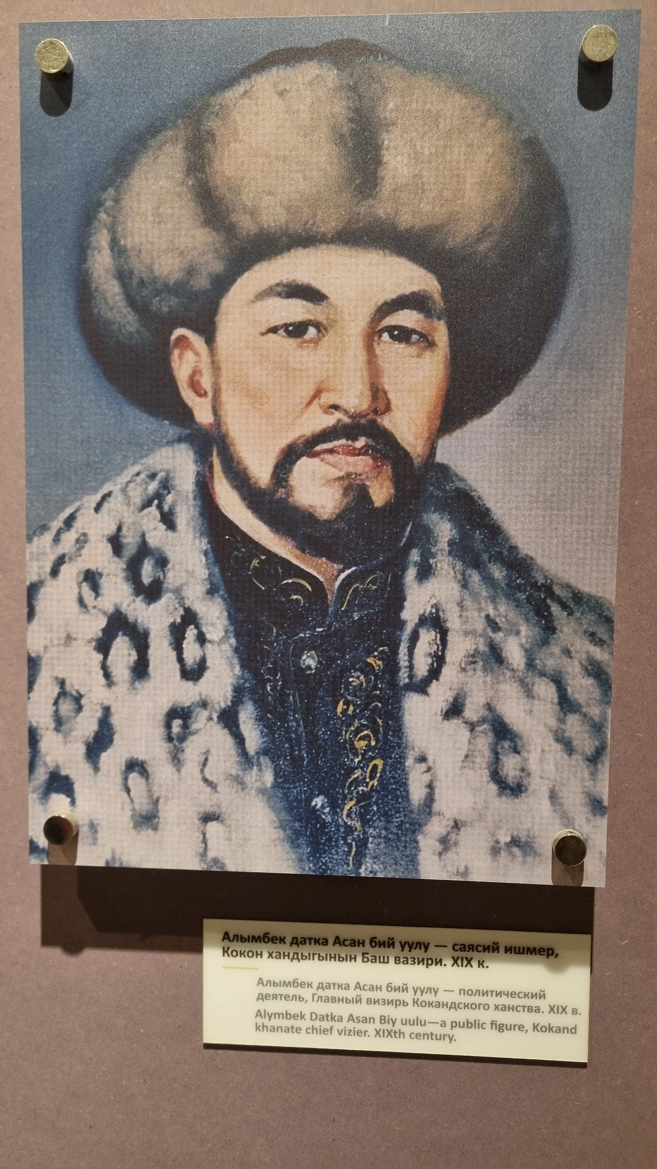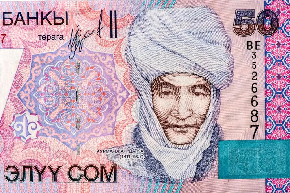 키르기즈 50솜짜리 지폐의 표지인물은 머리 위로 붕대를 둘둘 말아 두른 듯 특이한 전통모자, 엘레첵(Elechek)을 쓴 할머니다. 그 분이 “산악의 여왕”이란 별명으로 키르기즈 민족을 구한 민족의 영웅이자, 강인하고 지혜로운 여성의 표상으로 오늘날까지 존경받고 있는 쿠르만잔 다트카(Kurmanjan Datka(1811-1907)다.