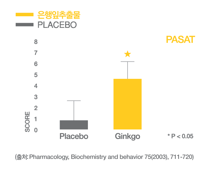 플라보놀배당체는 인체적용시험에서 기억력을 개선시킨다는 결과를 내기도 했는데요. 53세에서 65세의 폐경기 이후 여성31명을 두 개 그룹으로 나누어 한 그룹에는 은행잎추출물을 일일120mg씩 7일간 섭취하게 했고, 다른 그룹에는 위약을 투여하였는데 PASAT검사(작업기억력 평가를 위해 무작위로 제시한 숫자를 몇 초간 보여주어 합계를 계산하도록 하는 테스트)에서 은행잎추출물을 섭취한 그룹이 대조군에 비해 2.5배에 가까운 기억력향상 결과를 보였습니다.