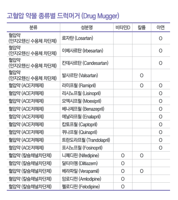 고혈압약을 복용하는 분이라면 자신이 어떤 약물을 복용하고 있는지를 정확하게 파악하여야 합니다. 고혈압약은 다양한 기전으로 작용하므로 작용기전에 따라 고갈되는 영양소가 달라집니다. 자신이 복용하는 약물에 따라 고갈되어 별도로 섭취해야 하는 필요한 영양소가 다르기 때문에 같은 고혈압이라고 해도 자신에게 맞는 영양소의 선택은 중요합니다.