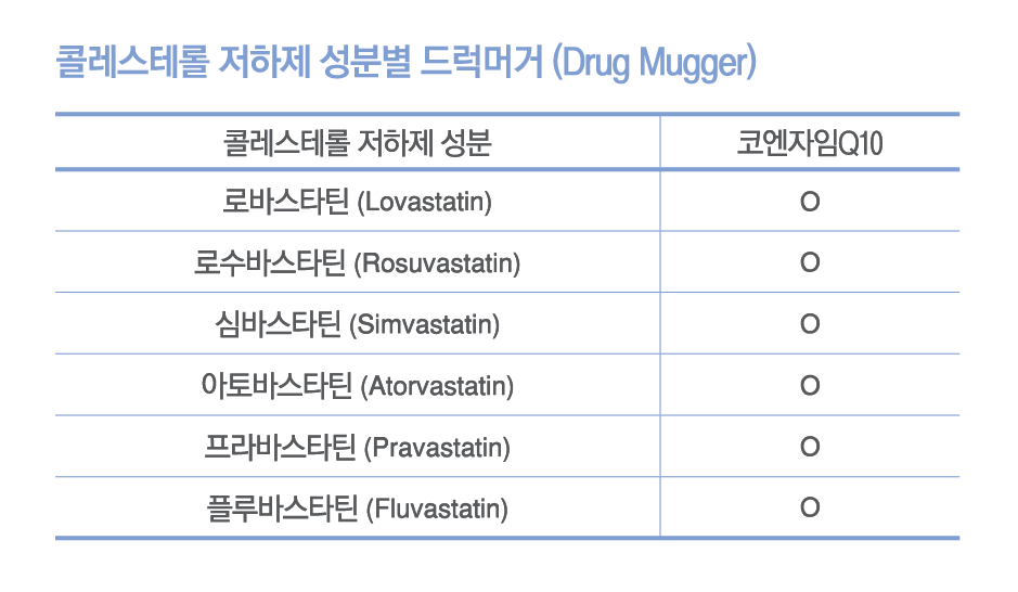 코엔자임Q10은 모든 세포의 산소와 에너지 수준을 관리함과 동시에 항산화작용을 하는 대표적인 영양소로 부족해지면 혈당조절능력저하, 심장기능저하, 근육수축능력저하, 면역기능저하, 뇌기능저하 등의 증상을 불러올 수 있습니다. 따라서 스타틴계열의 약물을 사용할 때는 반드시 코엔자임Q10을 보충해주어야 합니다.