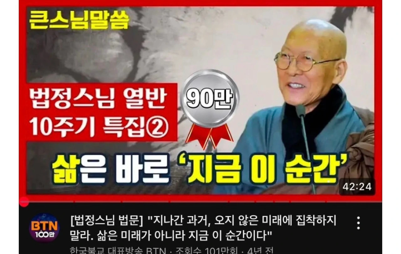법정스님은 무소유라는 책에 대해 읽어 보았고, 이분의 유트브로 법문을 들어보면, 말보다 글을 잘 쓰신다고 생각한다. 법륜스님은 청중을 부드럽게 리드 하시고 양방향으로 소통하고, 유모도 꽤 있으신 반면,
