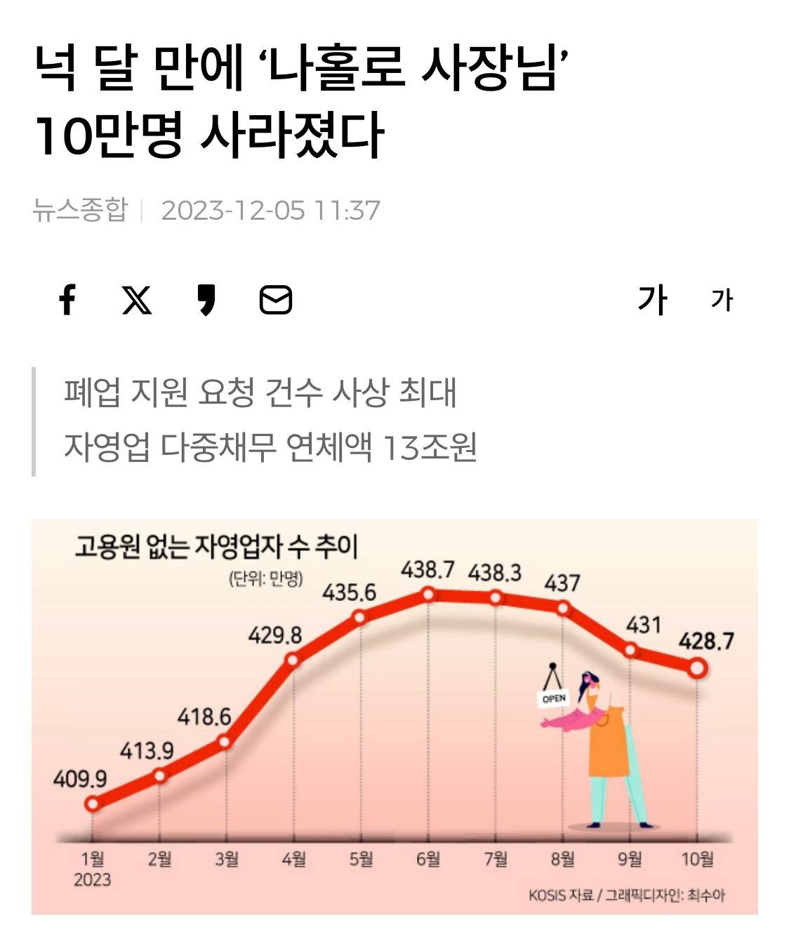 나와 같은 고용원 없는 자영업자가 4개월 만에 10만 명이 줄어들었다. 폐업 철거지원 요청 건수 사상 최대, 자영업 다중채무자의 연체규모는 13조 원을 돌파했다. 고물가, 고금리가 영세 소상공인을 직격 하면서 이제 벼랑 끝에 다다른 상황이다. 이자비용이 10% 이상 오른 상황 속에서 나 홀로 사장님 10명 중 4명은 내년도 최저임금 보다 낮은 수준의 사업소득을 올리고 있다.