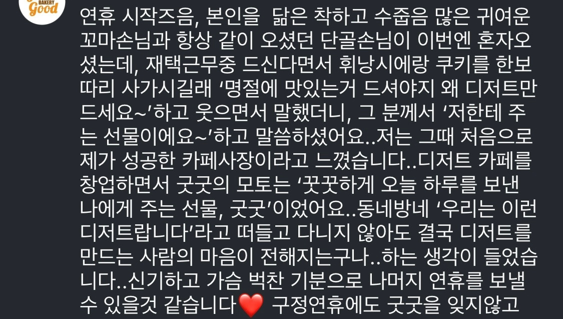 수년을 매일 일터로 나가, 카페를 쓸고 닦고, 디저트를 만들며 육체노동을 하고, 직접 손님들을 대면하고 소통하며, 내가 이루어놓은 것들이 진짜성공이라는 생각이 들었습니다.