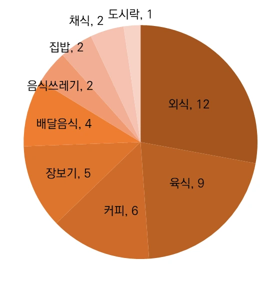 먹거리 부문에서는 외식 관련 실천다짐이 많았어요. 외식은 집밥보다 3배 정도 많은 이산화탄소를 배출하기 때문에 외식을 줄이는 것은 탄소저감에 큰 효과가 있죠. 참여자들은 외식하지 않기(2건) 보다는 외식 줄이기(9건)나 외식 간소화(1건)에 관련한 실천 다짐을 많이 했어요. 우리의 생활패턴이 외식이 잦은 식생활로 변화되었음을 느낄 수 있었죠.