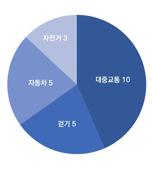 교통부문에서는 대중교통과 관련된 실천다짐이 10건으로 가장 많았어요. 버스나 지하철과 같은 대중교통을 이용하겠다는 실천다짐이 7건, 대중교통의 이용시간을 늘려보겠다는 실천다짐이 3건으로 나타났죠. 이중에는 출퇴근수단을 대중교통으로 변경하려는 다짐도 포함되었어요.