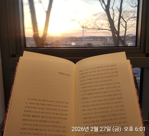 서쪽으로 난 창 앞에서 다리를 뻗고 등을 기대어 3시간쯤 앉아서 책을 읽었어.