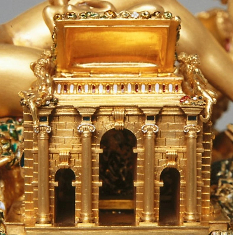 이 엄청난 황금 조각을 떠받치고 있는 기단부는 검은 흑단목으로 제작되었습니다. 그 위에는 사계절을 상징하는 정교한 조각상과 적색 에나멜 장식, 그리고 바람의 신과 녹색 에나멜 장식이 빈틈없이 놓여 있습니다. 양념통의 받침대에 당대의 우주적 질서를 완벽하게 축소해 표현해 낸 것입니다.