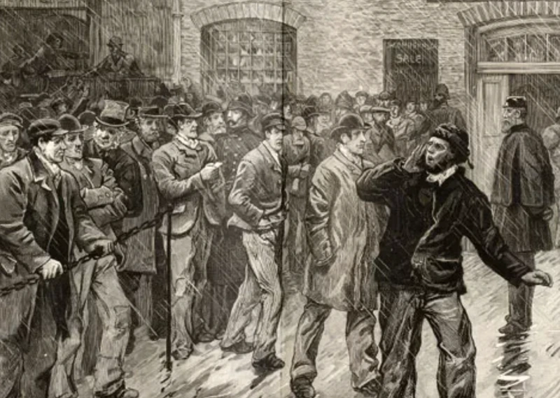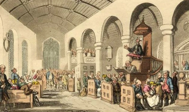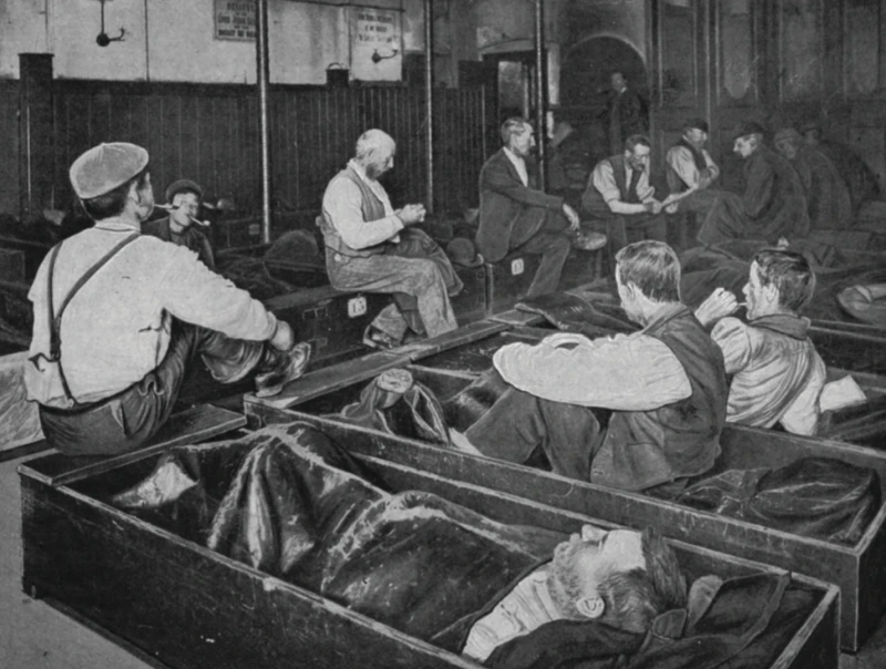 당시 런던 최하층 노동자의 삶은 처참했습니다. 집이 없어 4 페니를 내고 구세군 관짝(Coffin bed)에서 자거나, 그마저 없으면 2 페니를 내고 벤치(Hangover)에 줄을 매달아 기대자는 신세였습니다. 하지만 역설적이게도 그들은 품위를 유지해야만 했습니다. 당시 교회는 단순한 종교 시설이 아니라, 일종의 사회적 신분 보장소였기 때문입니다.