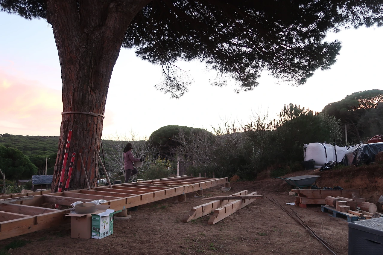 '요가데크'라고 부르는 곳은 추후 요가뿐만 아니라 다양한 워크숍, 공연 등 사람들이 모이고 어울릴 수 있는 공간으로 쓸 예정이라고 한다. 필지의 가장 꼭대기에 두 사람이 양팔로 안아도 다 안기지 않는 큰 소나무가 있는데 그 나무를 뱅 둘러 데크를 설치하고 있다. 데크에 쓰일 나무들은 이미 다 재단되어 있고, 우리는 그 나무들을 받칠 주춧대를 만드는 일을 하는 것이다. 한국에서는 건축을 할 때 이미 만들어진 주춧돌을 사용해서 기초를 다지는 걸 많이 봤는데, 이렇게 하나씩 일일이 만드는 것이 신기했다. 추측컨대, 데크를 올릴 땅이 모래땅이라 기초를 깊게 하기 위해 직접 하는 것 같았다.