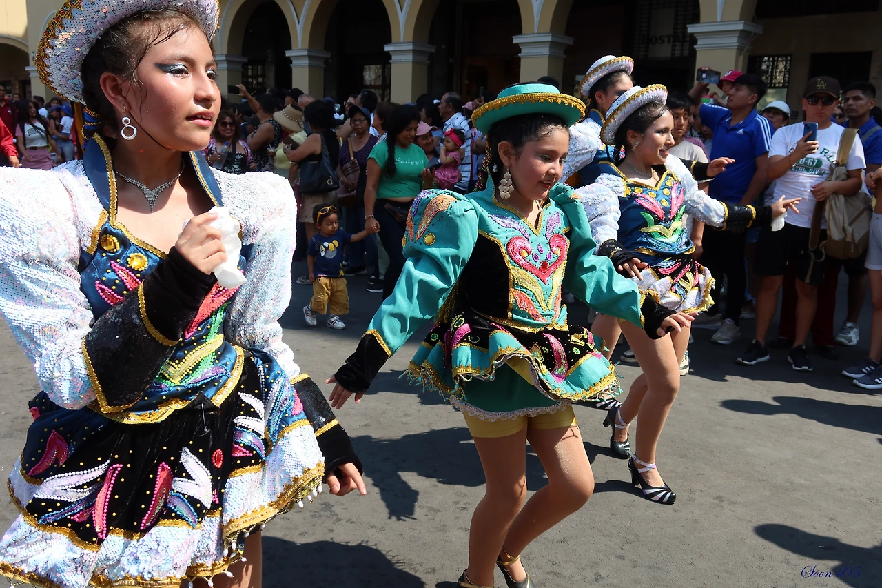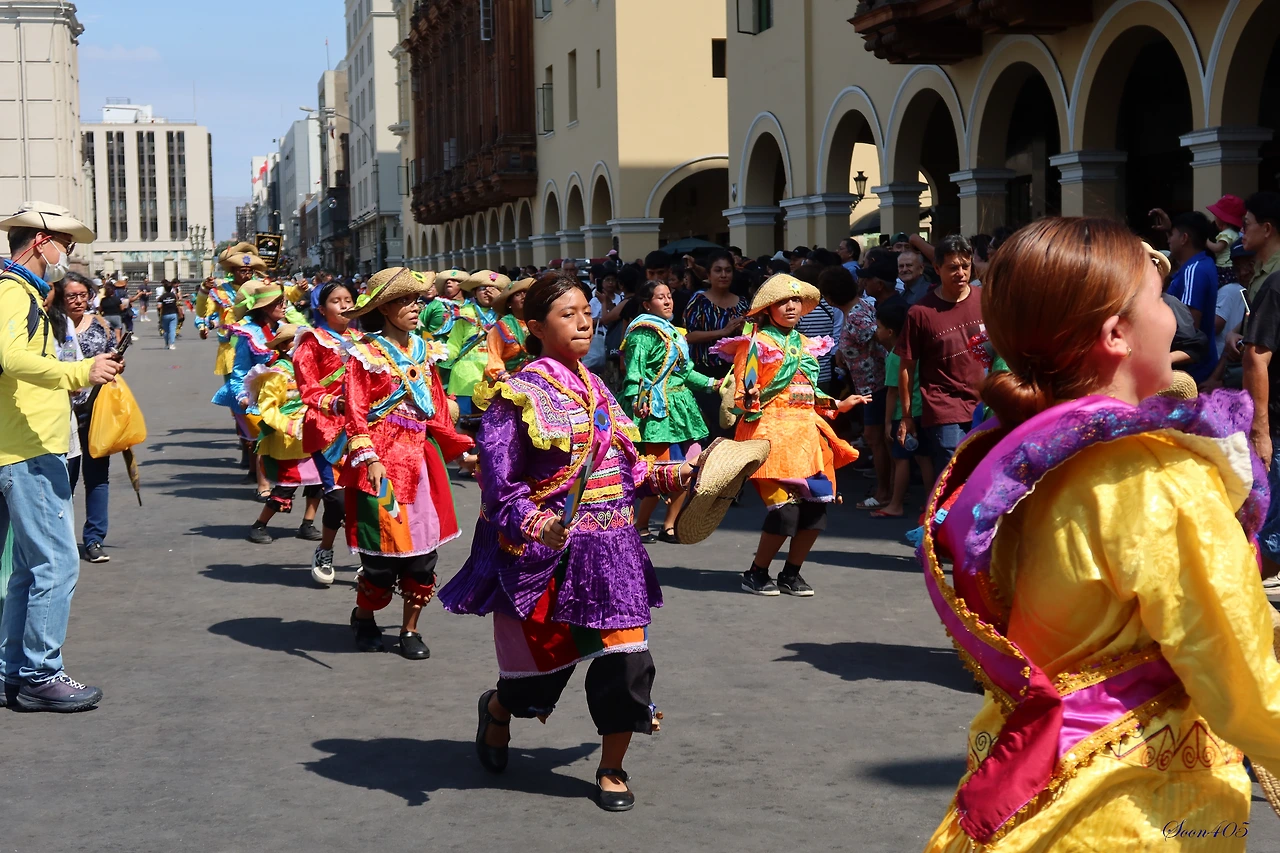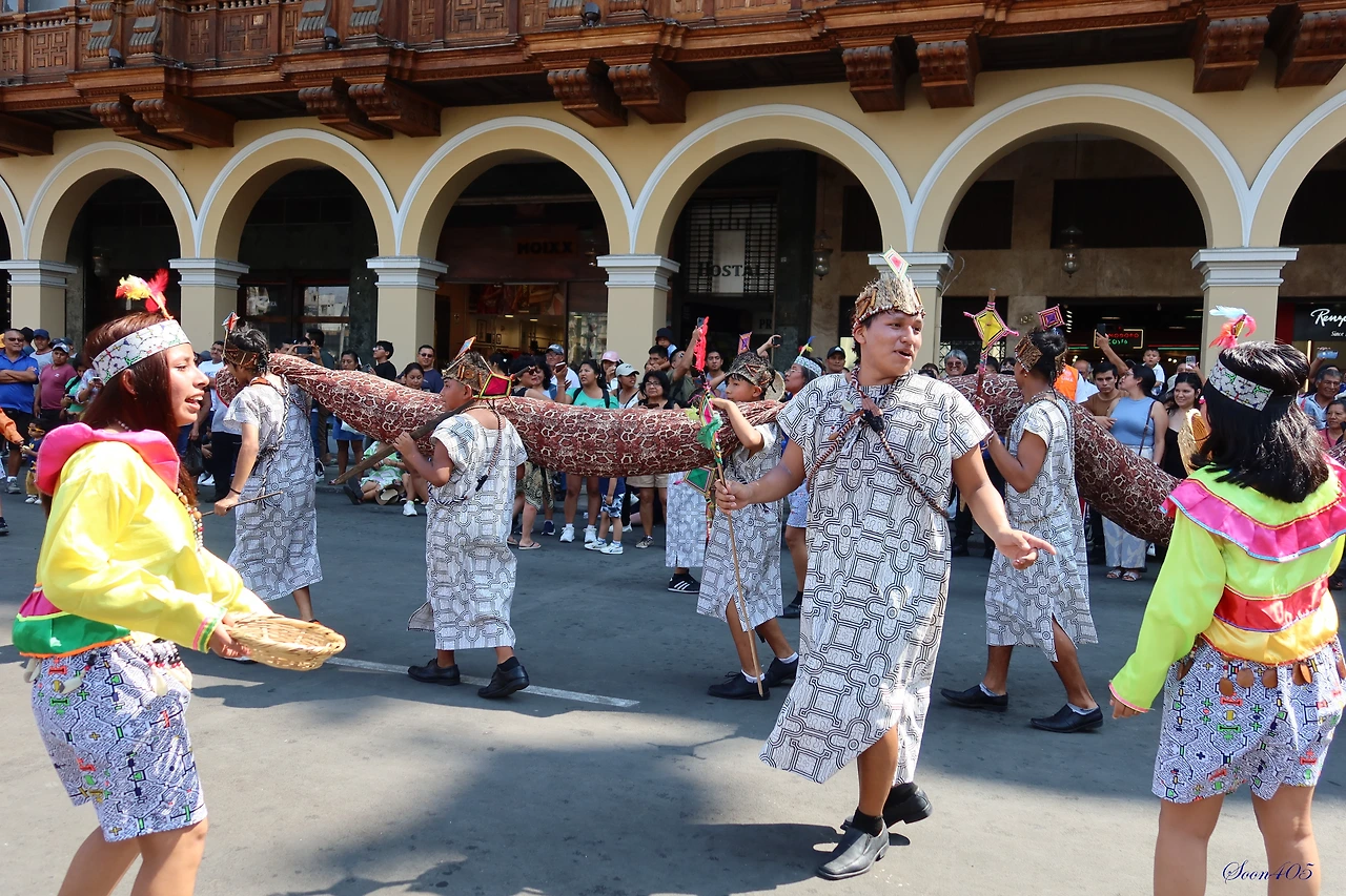 광장을 돌아보고 있는데 성당 쪽 골목이 시끌시끌하더니 춤 퍼레이드가 몰려온다. 스페인 풍의 춤꾼들이 앞서고 뒤이어 인디언 전통춤, 정글지역 원주민 춤을 추는 사람들이 화려한 원색의 옷을 입고 무리 지어 공연을 한다. 아나콘다로 보이는 거대한 헝겊 뱀 모형을 들고 춤추는 패도 있다.