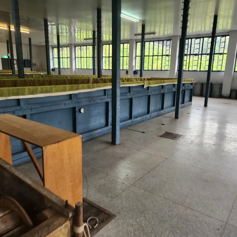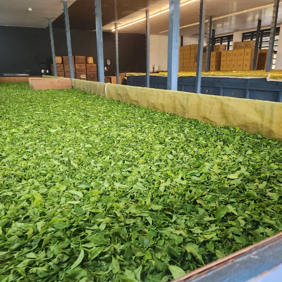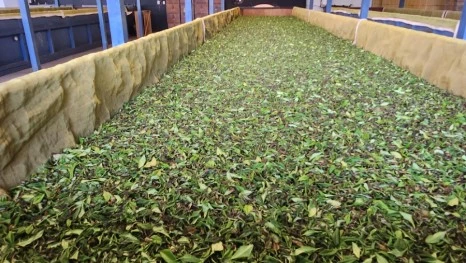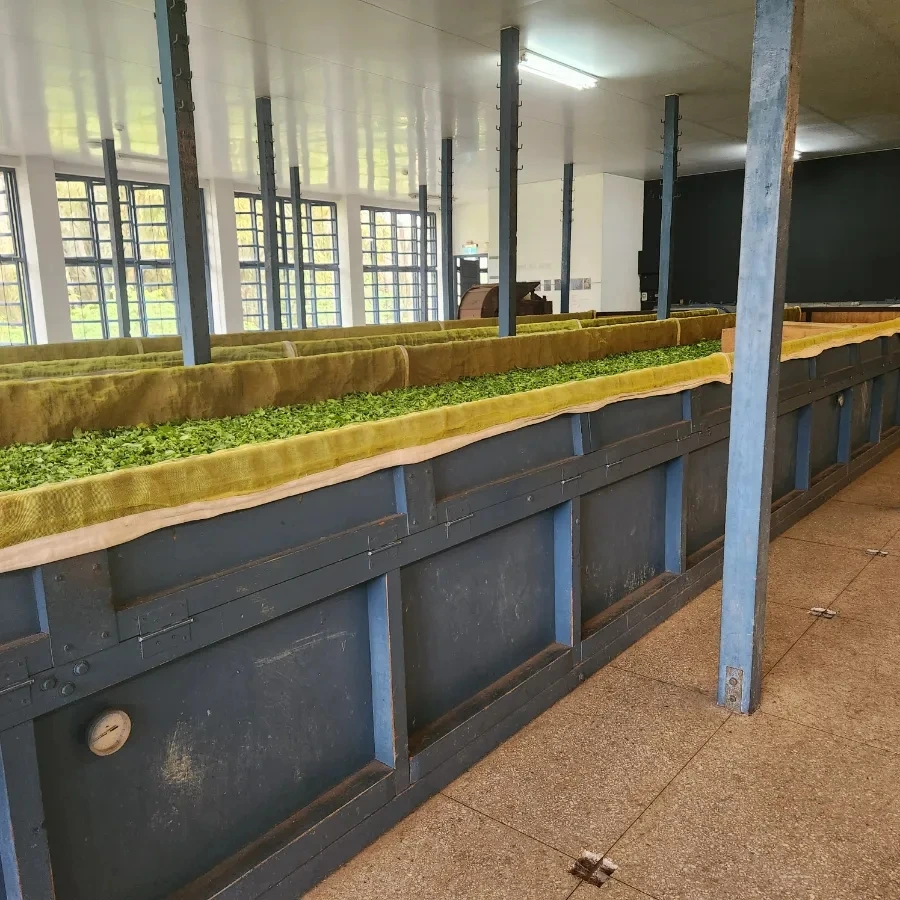 홍차제다 공정 중 가장 중요한 위조와 유념 과정입니다. 위조대가 넓게 펼쳐져 있고 지난밤부터 위조되고 있는 찻잎이라고 합니다. 홍차는 찻잎을 채취하고 유념하기 전까지 찻잎을 펼쳐 위조과정을 거치는데 유념을 하기 위한 전 단계입니다. 찻잎의 수분이 68%가 되어야 비로소 유념을 시작하게 되지요.