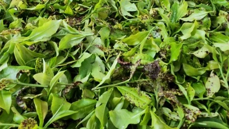 초록엽선 벌레의 충해를 입은 찻잎을 제다 하면 색택이 뛰어나고 홍옥특유의 품종미로 회감이 오래 간다고 합니다. 그래서 이러게 벌레가 먹은 여름 계절에도 차를 만들고 있네요.