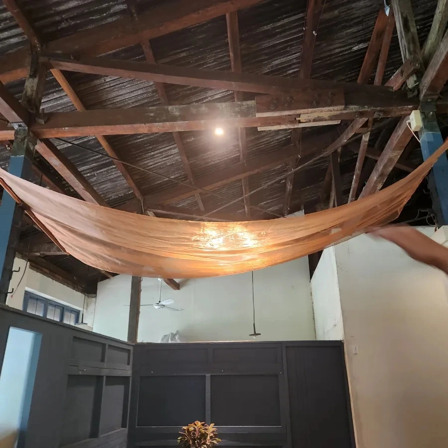 천정에 걸어둔 천의 흔들림으로 바람의 세기를 보기도 합니다. 뒤편에 있는 천정형 선풍기는 바람이 없는 날 돌아가기도 하겠죠.
