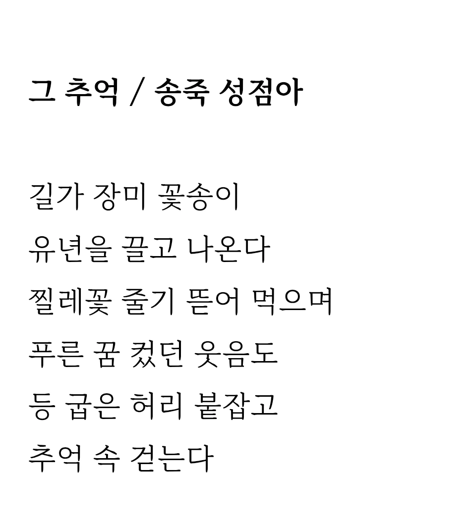 성점아 시인은 어디에서도 떳떳하고 바른 어른이었다. 한평생 한결같이 깔끔하고 당당한 여장부였다. 농부의 아내, 맏며느리, 삼 남매 홀어머니, 소상공인 사업가, 교회의 권사, 자원활동가, 시인.