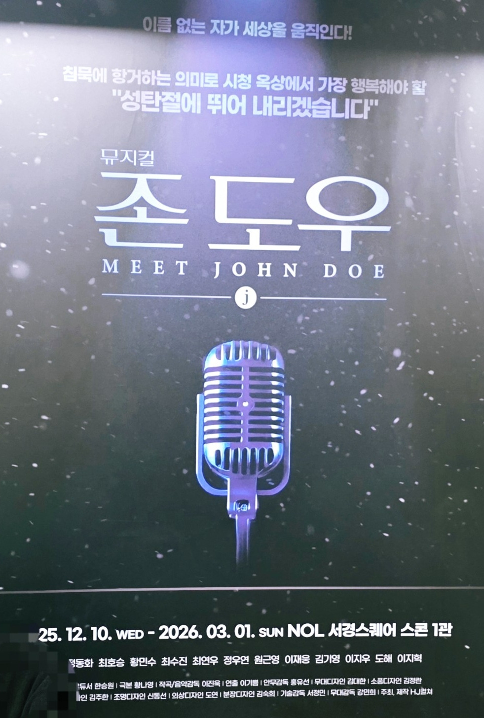 뮤지컬 [존 도우]는 희망을 만들어내는 이야기이면서 동시에, 그 희망이 얼마나 허술하게 조작될 수 있는지를 보여준다. 가짜로 시작된 외침이 진짜 목소리가 되는 과정에서 우리는 무엇에 귀 기울이고 있는가.