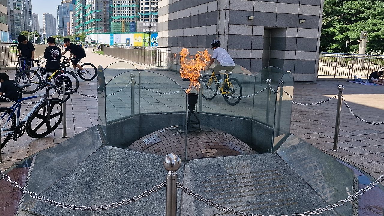 88 올림픽 때부터 있는 실제 불꽃이다! 주변이 그늘이고 몇 발자국 떨어져 서있는데도 불기운이 후끈 달아오른다.