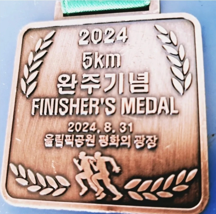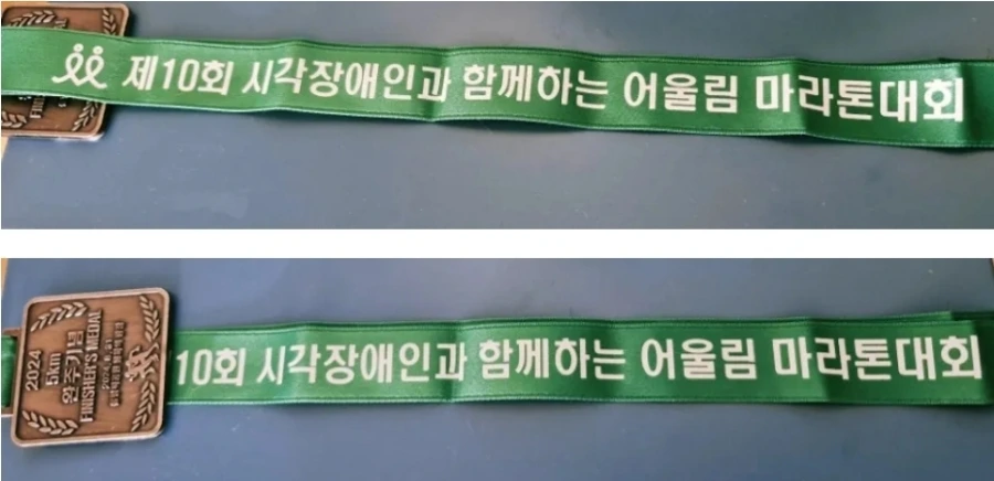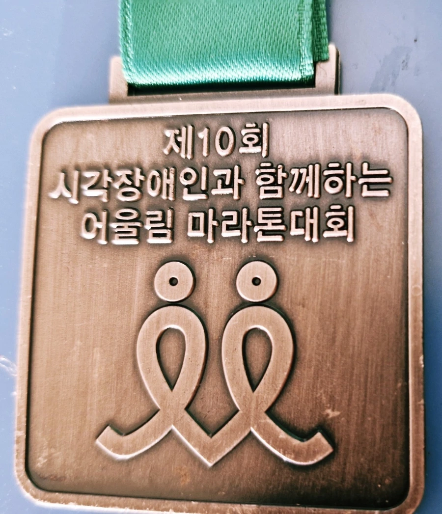 념메달이 볼수록 더 근사해서 앞뒤로 자세히 바라본다. 우리는 도보코스라 뛰지는 못했으나 현장에서 같이 걷고 봐온 러너들의 간절한 숨결이 뿜어져 온다. 그리고 팔짱을 끼고 호흡 맞추며 '같이 가치로운' 마라토너들의 배려와 경청, 조화로운 발걸음이 보인다.