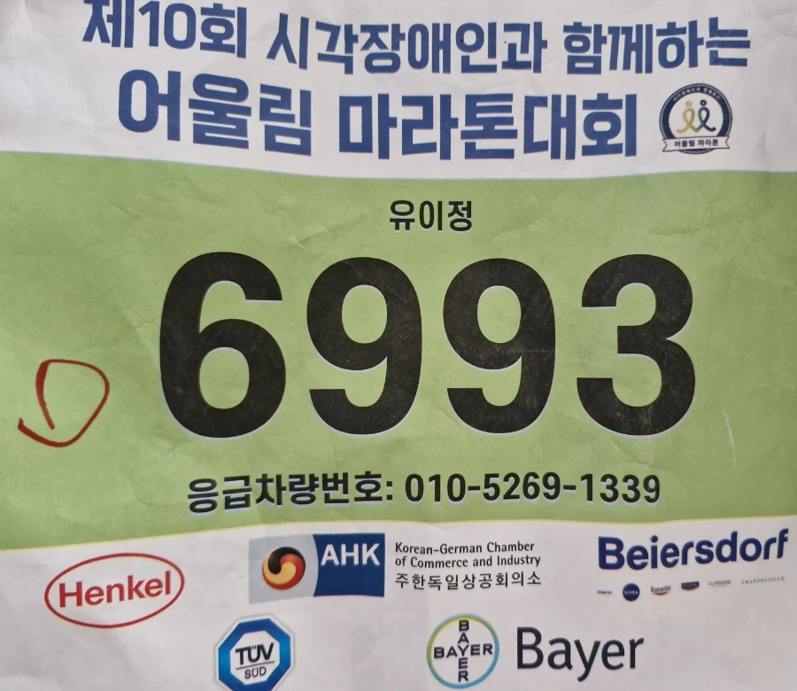 우리는 하프 마라톤 5킬로 출전자, 사전등록자 부스에서 배번호를 받고 서울지역 지회 시각장애인 천막에서 대기했다. 10킬로는 마라토너팀, 5킬로는 도보 출전이다.