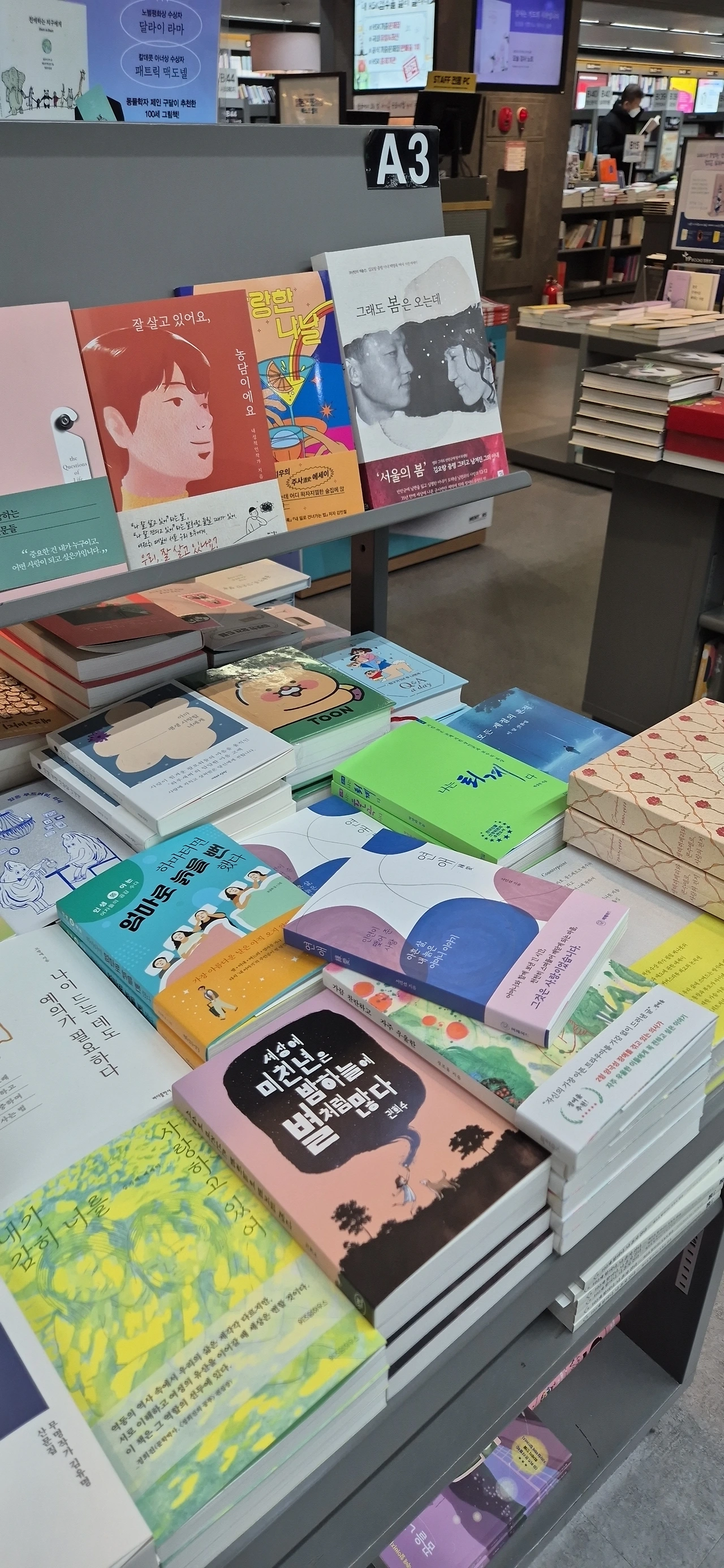 그리고 드디어, 오프라인 서점에 제 책이 등장한 날. 제 눈으로 제 책을 보러 달려가 봤어요. 이미 왜 아직 교*문고에, 영*문고에 선생님 책이 없냐며 학생들에게 귀여운 항의를 받은지라, 재고 수량을 확인해 보고 갔고요. 드디어 제 눈으로 제 책이 매대에 있는 걸 확인했습니다. 물론 '신간 에세이'코너였지요. 너무 좋았지만, 정말 좋은 책들도 측면 서가로 아니면 아랫면 서가로 이동해 있는 걸 보고는... 내 책도 조만간 저리로 신속하게 가겠구나 생각하며 벌써부터 쓸쓸하기도 했습니다.