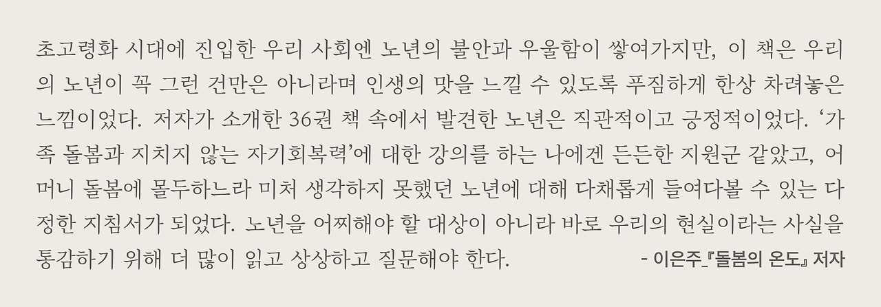 이 책은 거의 기획 출판에 가까워요. 헤르츠나인 대표님과 미팅을 할 때는 거의 샘플 수준의 원고만 있었거든요. 지금 생각해 보면 제 스타일의 독서감상문 12편과 <노년을 읽습니다> 책 제목만 있었던 것 같아요. 그럼에도 불구하고 대표님이 '기획이 아주 좋다'면서 함께 만들어 보자고 제안해 주셔서, 그렇게 이 책 쓰기가 시작되었습니다.