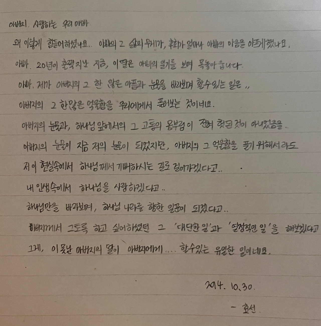 아빠는 천국에 갈 것 같은데, 저는 천국에 갈 수 있어요? 그럼 제가 천국에 못 가면 앞으로 아빠는 영영 못 만나는 거예요? 아빠가 천국에 간다면, 저도 꼭 나중에 천국에 가고 싶어요. 아빠를 못 만나는 건 너무 아파요. 하나님, 진짜 거기 계세요? 그럼 제발 저도 천국에 갈 수 있다고 알려주세요. 나 너무 무서워요.'
