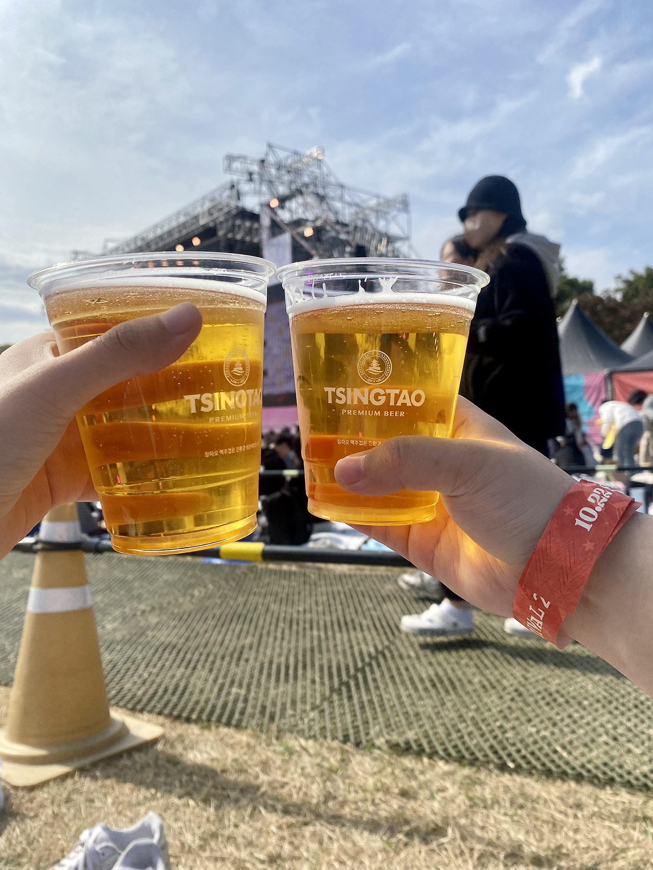 우리 앞에는 사람들이 지나가는 통로가 있었다. 그리고 그 앞에는 앞자리들이 많았는데, 이 자리를 선택한 우리에게 있어 뼈저리게 후회한 선택이었다. 사람들이 지나갈 때마다 무대의 시야가 가리고 아티스트들이 가린다. 처음엔 우리는 매우 불만을 떨었고, 이 자리를 선택하게 만든 나에게도 있어 더 큰 화가 났지만 시간이 지나면 그게 익숙해져 버린 우리였다. 우리는 돗자리를 피고 푸드존에서 맥주 두 잔과 케밥과 큐브스테이크, 그리고 탄두리를 먹었다. 맥주와 안주를 먹으면서 보는 공연은 20대의 청춘의 낭만을 더 부린다. 추울 거라고 생각한 날씨는 많이 따뜻하고 햇빛이 도달은 날씨이다.