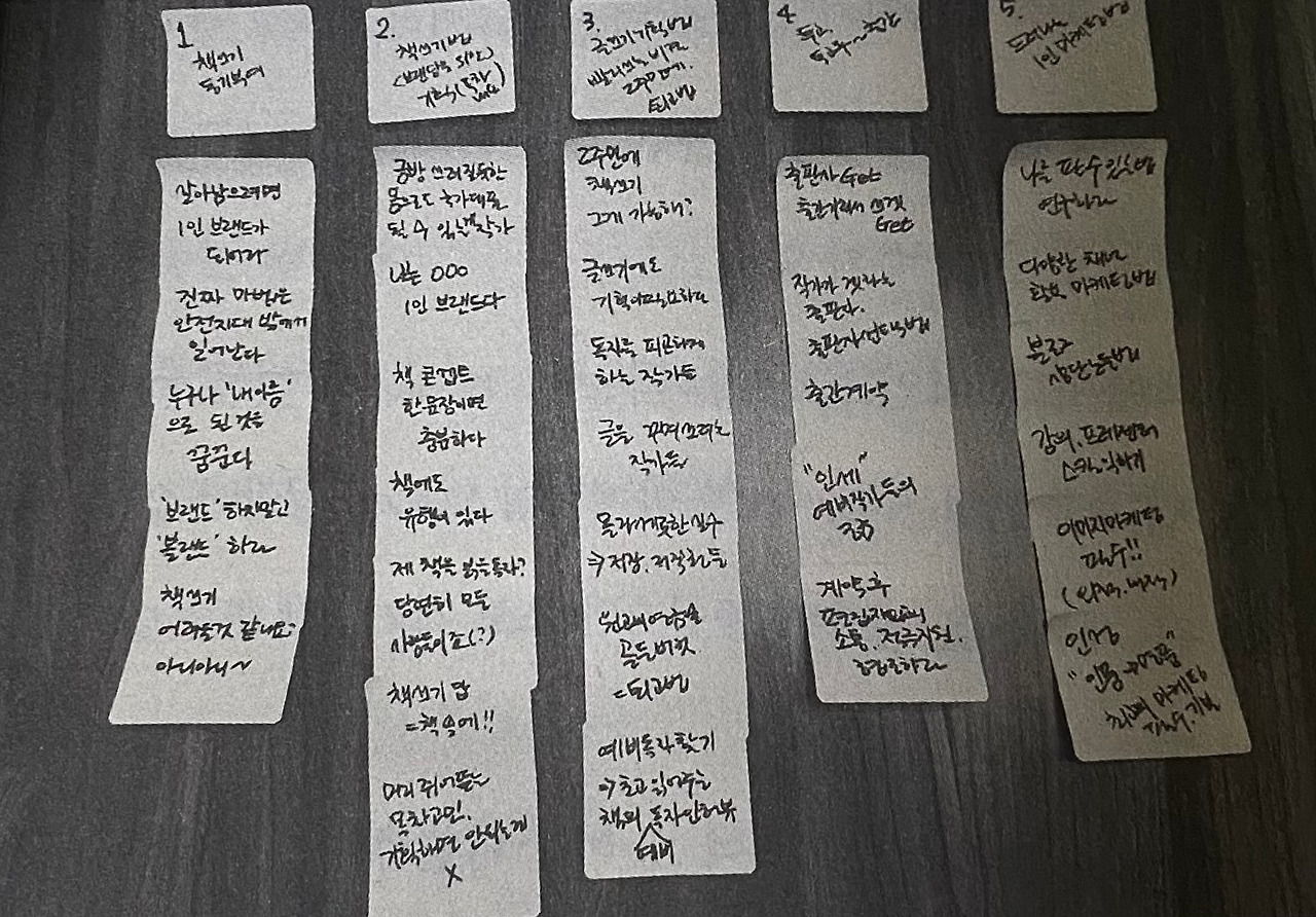 ③ 목차 문장이 적힌 포스트잇을 비슷한 것끼리 1~6까지 분류한다.