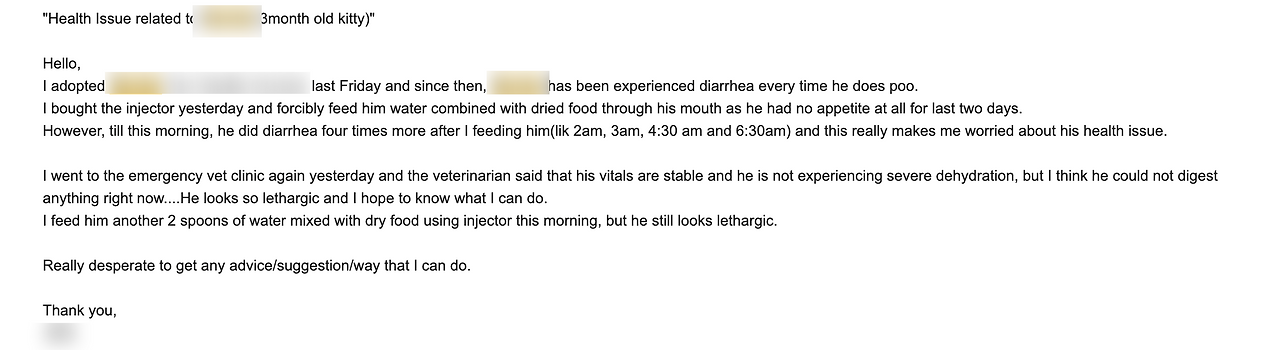 입양한 동물들이 새로운 환경에서 잘 지내고 있는지에 대한 물음과 함께 사진과 함께 소식을 공유해 달라는 내용이었다. 그 이메일이 나한테 한 줄기 빛 같았다. 얼른 답장을 보냈다. 옆에서 골골대는 아기고양을 보며, 이메일로 그동안의 상황을 구구절절이 설명을 했다. 그리고 내가 어떤 행동을 취해야 하는지, 밥을 안 먹는 아기 고양이가 이전에 좋아했던 특정 캔 종류가 있는지에 대한 질문을 덧붙였다.