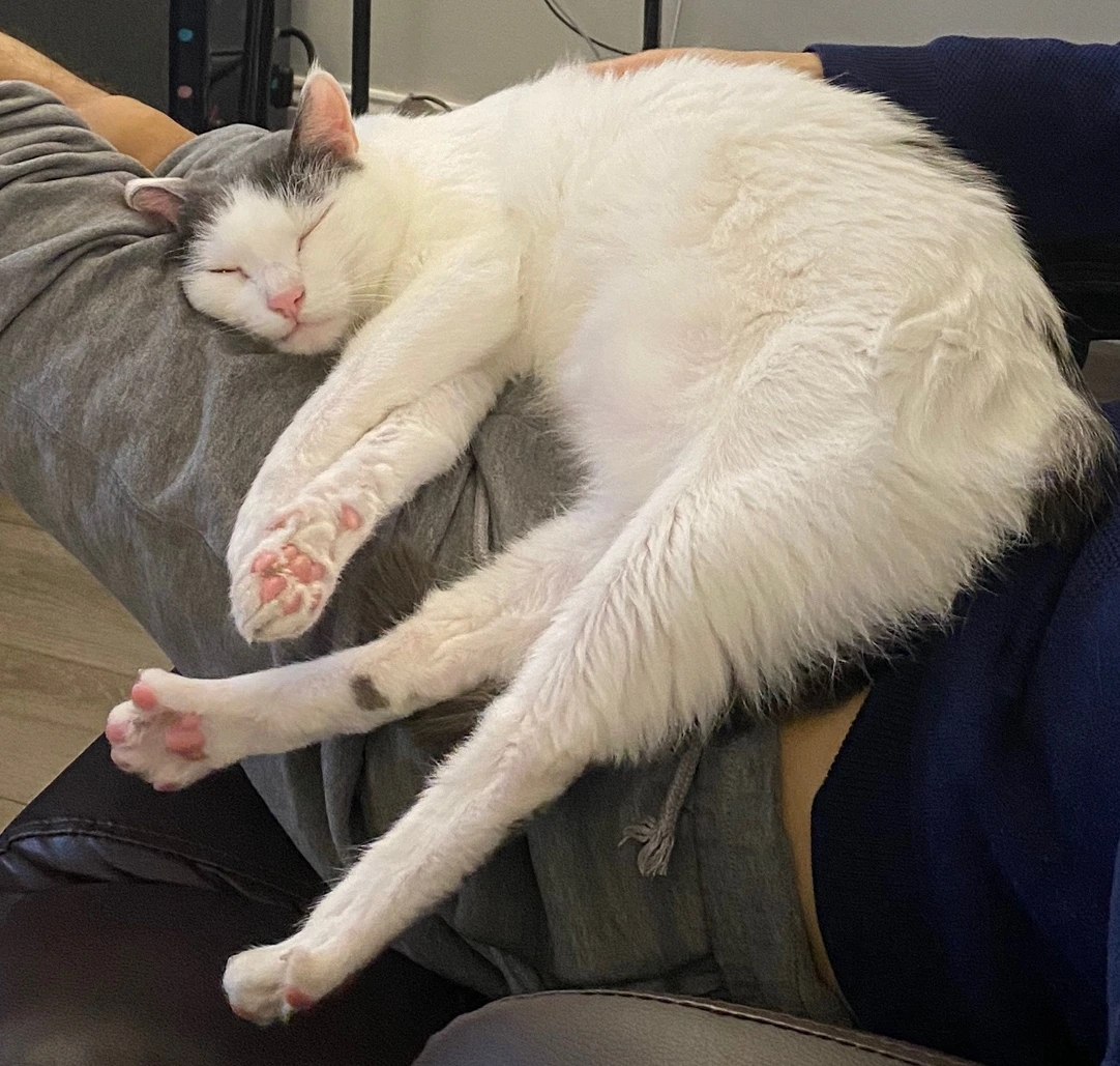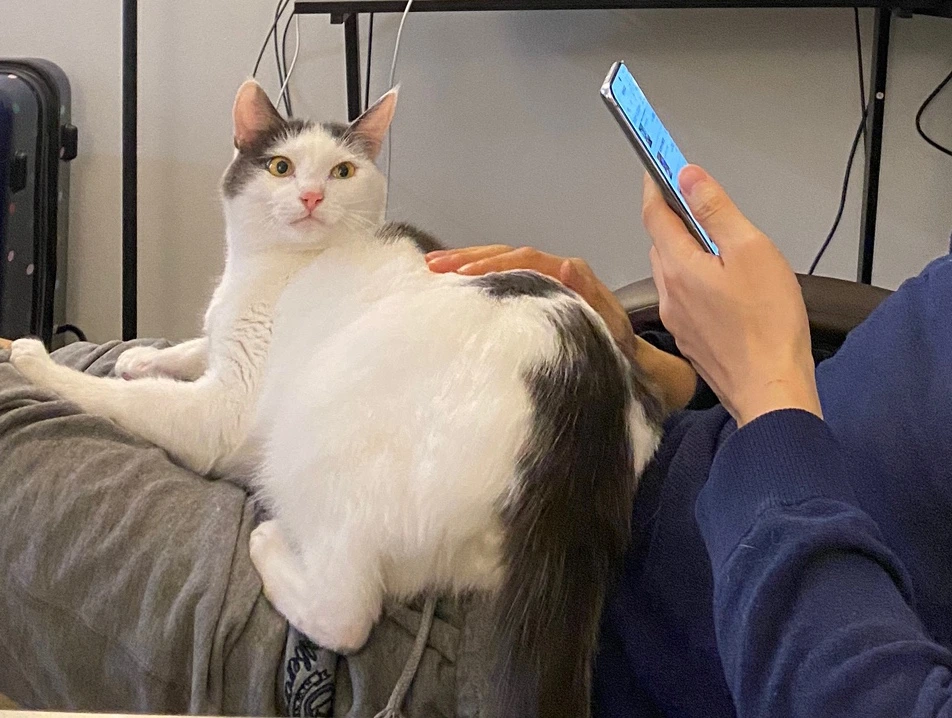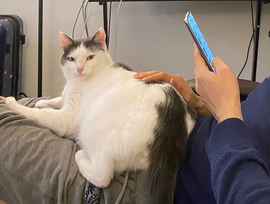 요즘 모찌를 보면 점점 무릎냥이를 넘어 개냥이가 되어간다. 원래 개냥이와는 거리가 멀었는데 의자나 소파에 앉아있으면 갑자기 무릎 위에 자리를 잡고 앉는다. 그럼 나랑 J는 그런 모찌에게 감동을 받아서, 좋아서 어쩔 줄 몰라하며 모찌 사진 찍기 바쁘다.