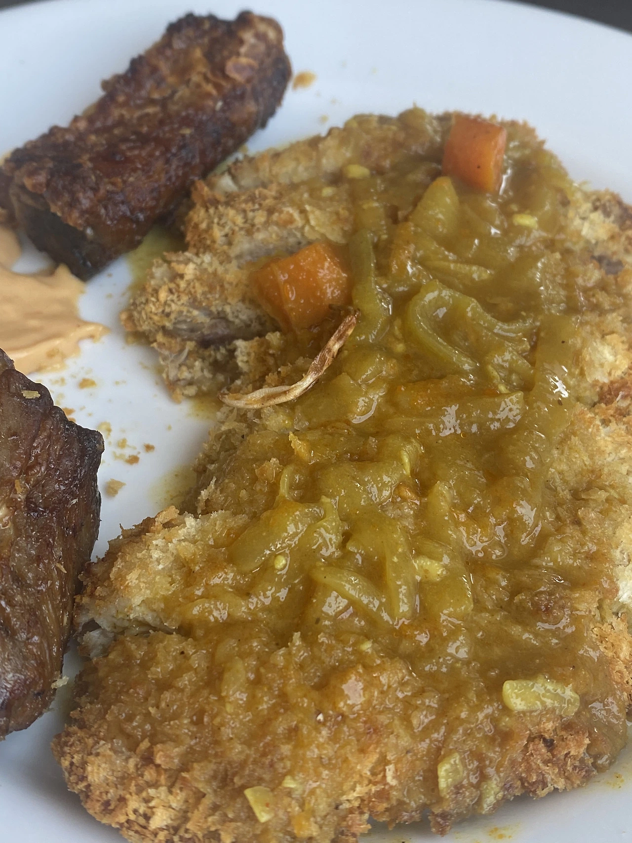 냉동 돈가스를 에어 프라이어에 돌리고 그 위에 카레 소스를 부어주면 여느 일식 레스토랑 못지않다.