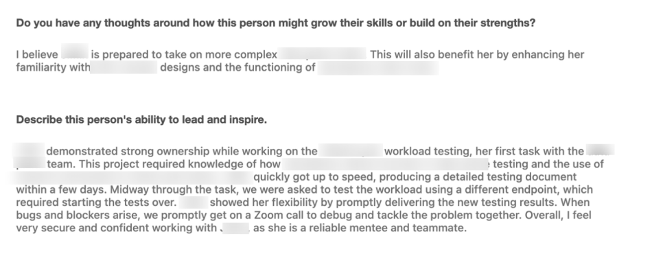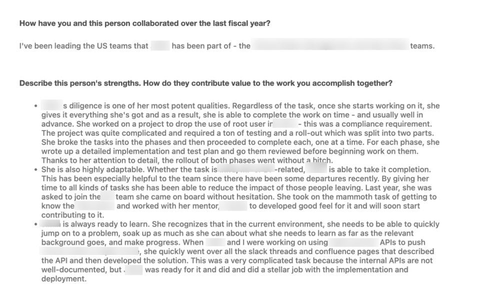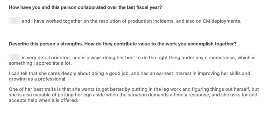 4월에 한 달간의 휴가를 갔다 온 뒤, 온콜이 끝나자마자 다른 팀원들들이 부탁한 퍼포먼스 리뷰도 해 주고 나도 나와 가깝게 일한 몇몇 분들께 부탁을 했다.