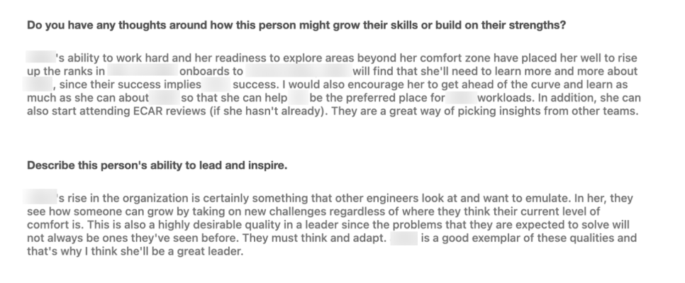 "In her, other engineers see how someone can grow by taking on new challenges regardless of where they think their current level of comfort is. This is also a highly desirable quality in a leader since the problems that they are expected to solve will not always be ones they've seen before."