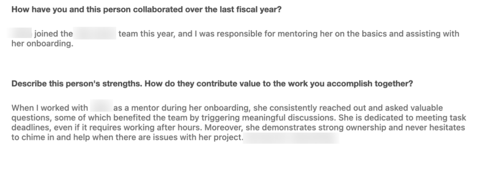 가끔 서로 바쁘면 피드백받는 것이 어려울 때도 있는 데다가 내가 퍼포먼스 리뷰 기간이 끝나기 며칠 전에 부탁을 해서 별다른 기대를 안했는데, 피드백 내용을 보고선 뜻밖의 감동을 받고 더 열심히 일하고 싶은 마음이 들었다.